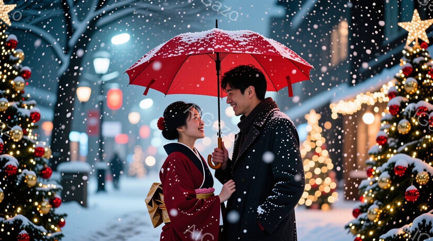 雪が降る中、着物姿の女性と黒いコートを着た男性が寄り添い、赤い傘を共有している。女性はクリーム色の着物に花柄が描かれ、髪は後ろでまとめられている。背景には、クリスマスツリーやイルミネーションで飾られた街並みが広がり、暖かくロマンチックな雰囲気を醸し出している。