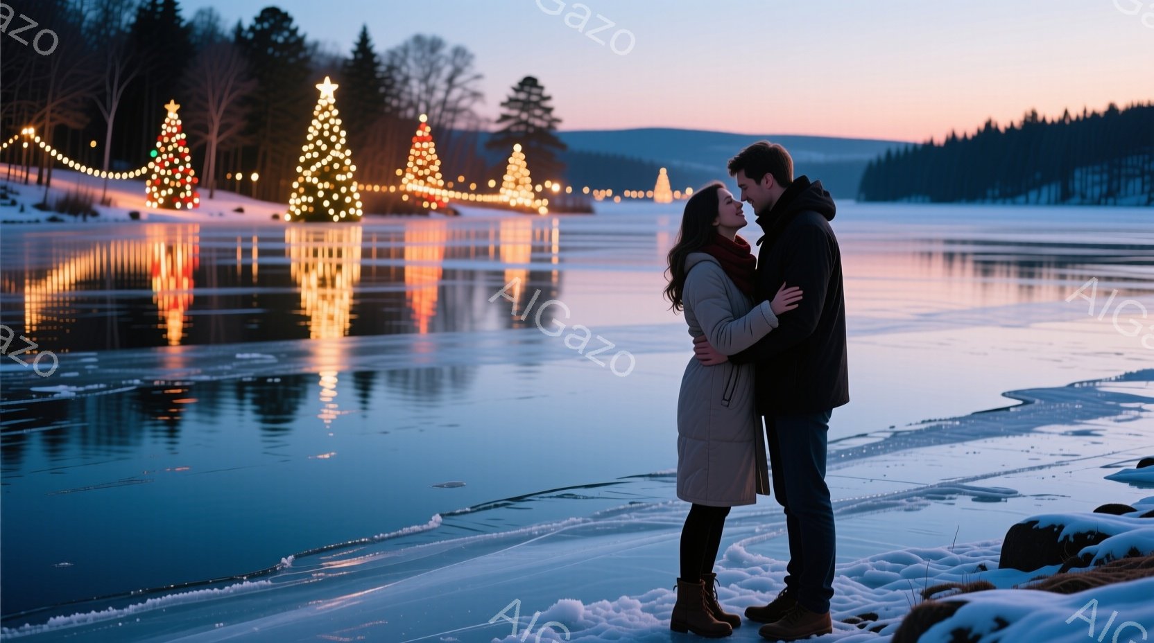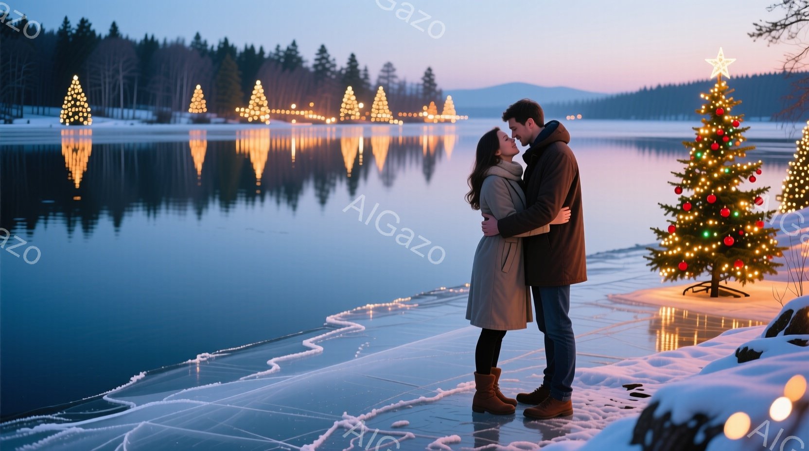 湖畔で寄り添う若いカップルが描かれています。女性は茶色の毛髪で、ベージュ色のコートと黒いブーツを履いています。背景には雪に覆われた木々と、クリスマスのイルミネーションで飾られた木々が並び、湖面にはそれらの光が反射し、冬の幻想的な雰囲気を醸し出しています。