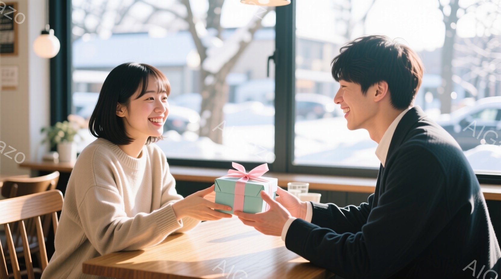 窓際のテーブルで、女性が男性からターコイズブルーのギフトボックスを受け取ろうとしている場面です。女性はクリーム色のセーターを着ており、短い黒髪で、笑顔を浮かべています。男性は黒いスーツを着ており、片手を差し出しながら穏やかに微笑んでいます。