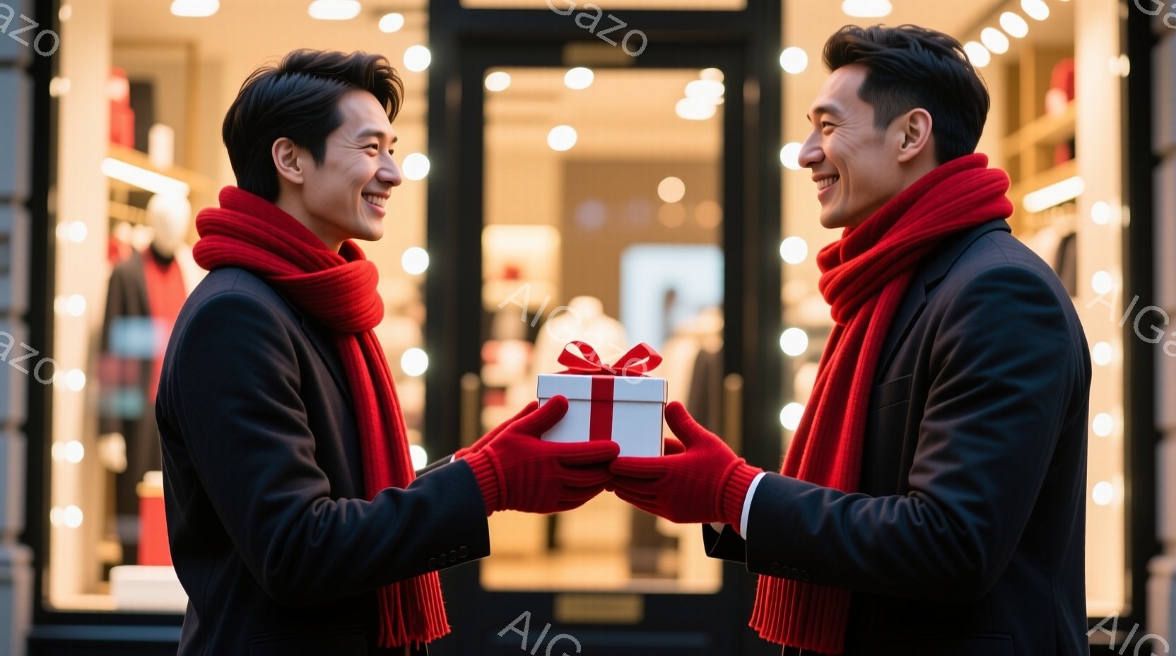 赤いマフラーを巻いた女性が、ラッピングされた小さなプレゼントを赤い手袋をはめた男性に手渡そうとしています。女性は微笑んでおり、男性はプレゼントを受け取る姿勢です。背景には、ショーウィンドウとぼやけた人影が見え、暖かく、親密な雰囲気を感じさせます。