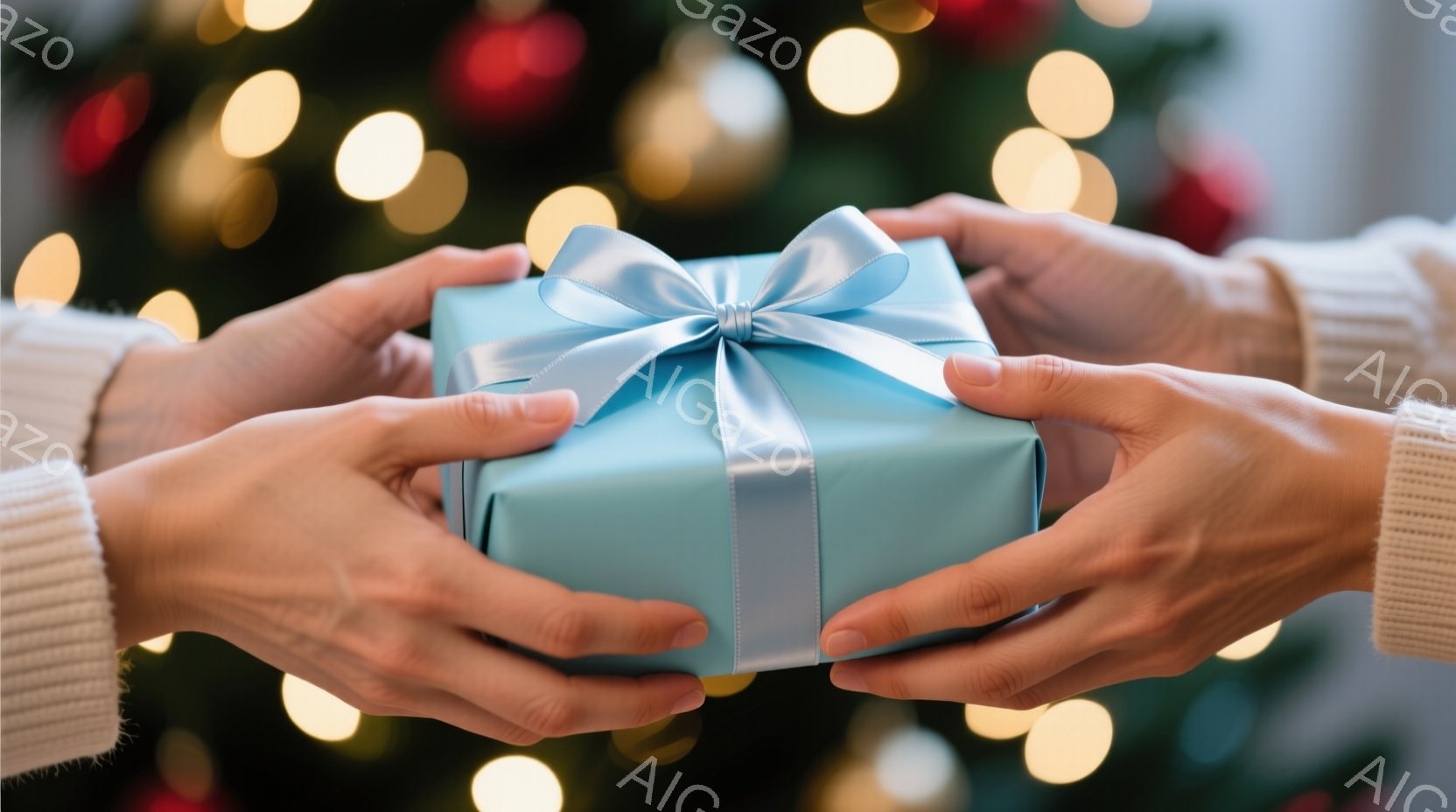 明るい水色のギフトボックスが、二人の手の間で渡されようとしています。贈り手の腕には、白いニットの袖が見え、背景にはぼやけたクリスマスツリーの飾りと光が散りばめられています。温かく、穏やかな、プレゼント交換の瞬間の雰囲気が伝わってきます。