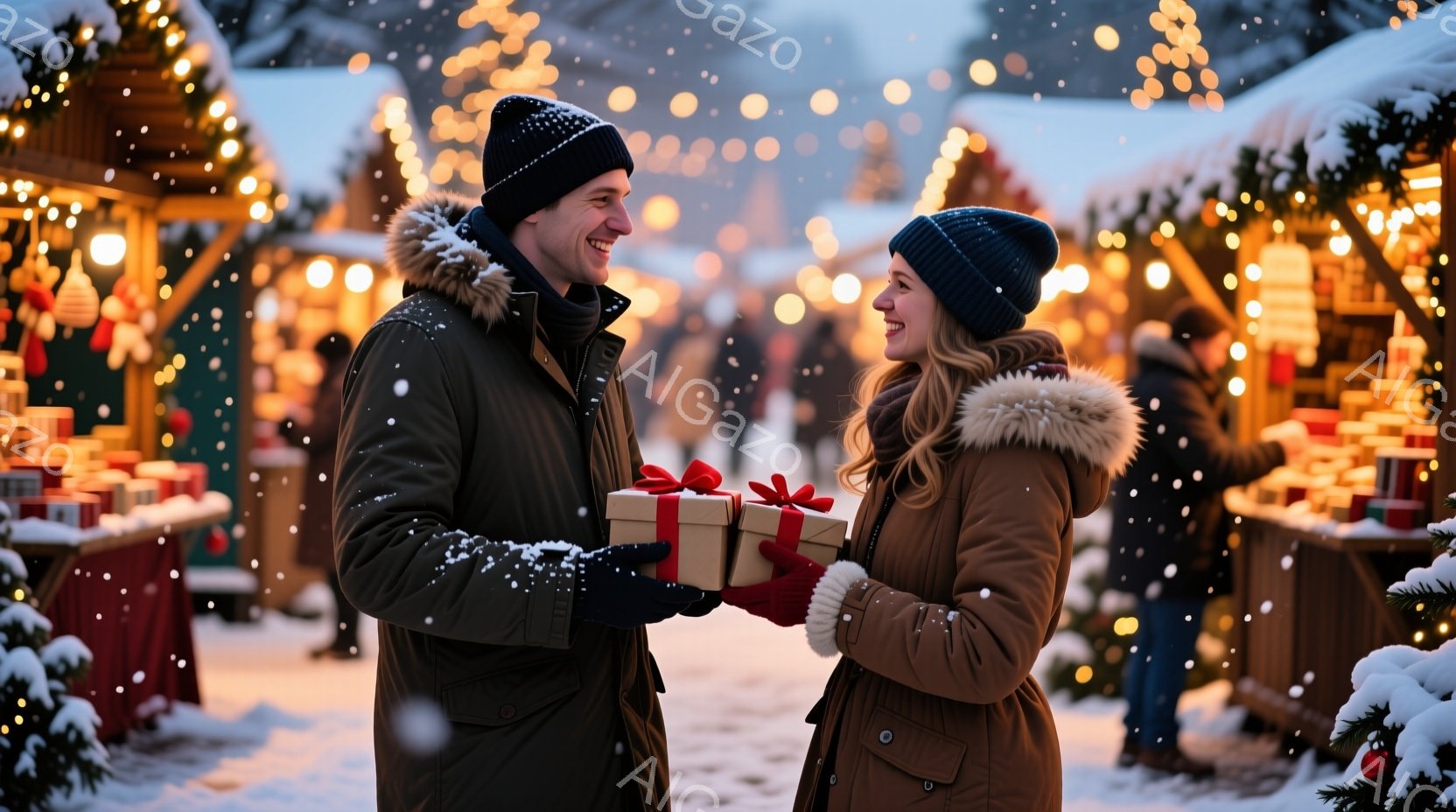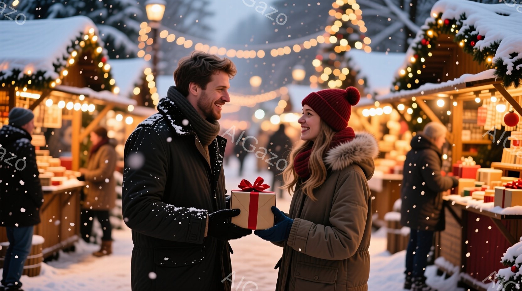吹雪の中、若い男女がプレゼントを交換し合っている。女性は黒いニット帽を被り、毛皮の襟付きの茶色のジャケットを着て、微笑んでいる。男性は黒いコートと赤いマフラーを巻き、女性に赤いリボンが付いたギフトボックスを手渡している背景にはクリスマスマーケットの賑わいと、光り輝く装飾が施された屋台が並び、冬の暖かくロマンチックな雰囲気が漂っている。