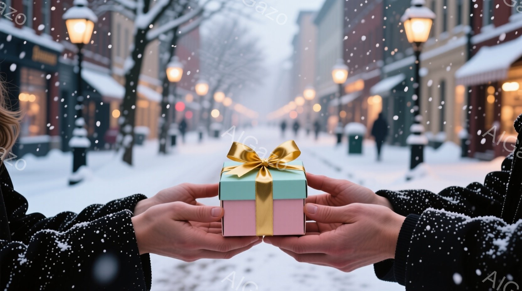 雪が舞う街並みの中で、二人の手が互いに向かい合い、小さなギフトボックスを交換しようとしている様子が捉えられています。ギフトボックスは水色とピンクの色合いで、金色のリボンが結ばれており、手の込んだ包装が目を引きます。背景には雪に覆われた建物と街灯が並び、冬の暖かく優しい雰囲気を醸し出しています。