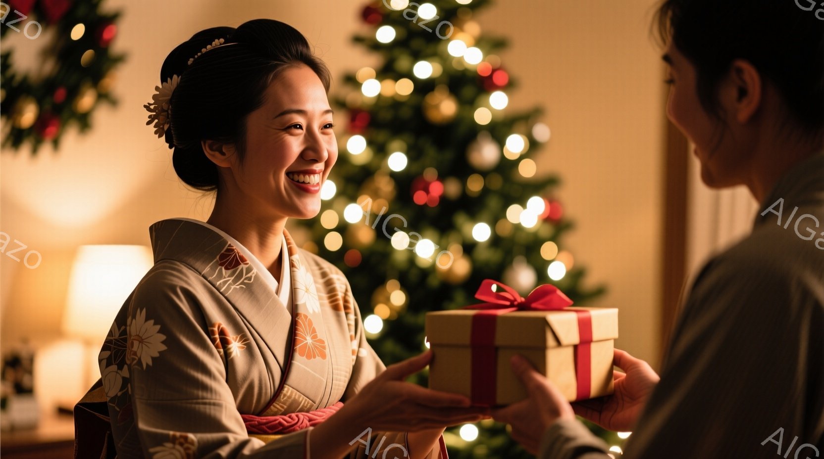 女性はクリーム色の着物を着ており、袖には美しい模様が描かれています。彼女は笑顔でプレゼントを差し出しており、髪は丁寧にまとめられ、髪飾りをつけています。背景にはクリスマスツリーが飾られており、暖かく、お祝いムードに満ちた雰囲気です。