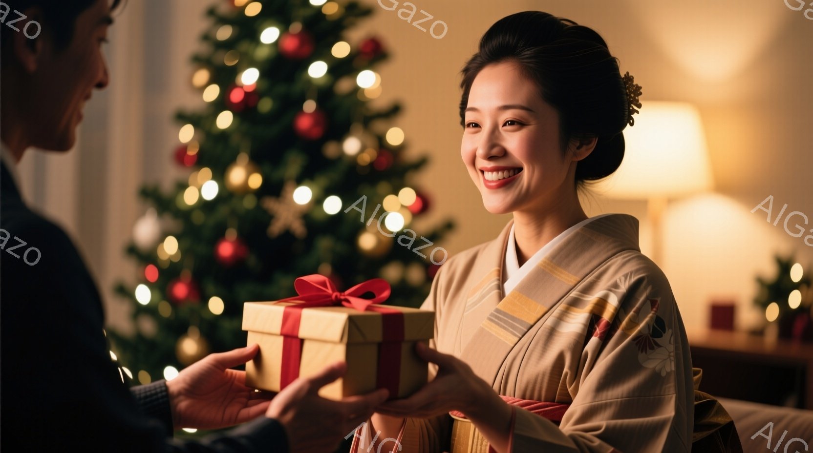 雪が降る街並みで、若い男女が互いに見つめ合い、男性が女性に赤いリボンで結ばれた小さなプレゼントを渡そうとしている様子が描かれている。女性はキャメル色のコートに長い髪をなびかせ、笑顔を見せている。男性は黒いコートを着て、温かく微笑みながらプレゼントを差し出している。