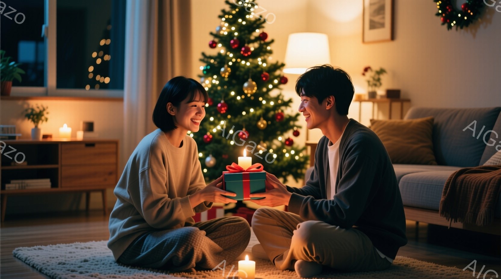 室内で、若い男女が床に座り、プレゼントを交換している様子が描かれています。女性はベージュのセーターを着ており、ロングヘアを後ろに垂らしています。男性は濃い色のセーターと白いズボンを着用し、優しい笑顔を浮かべており、背景にはクリスマスツリーやキャンドルが配置され、温かくロマンチックな雰囲気を醸し出しています。