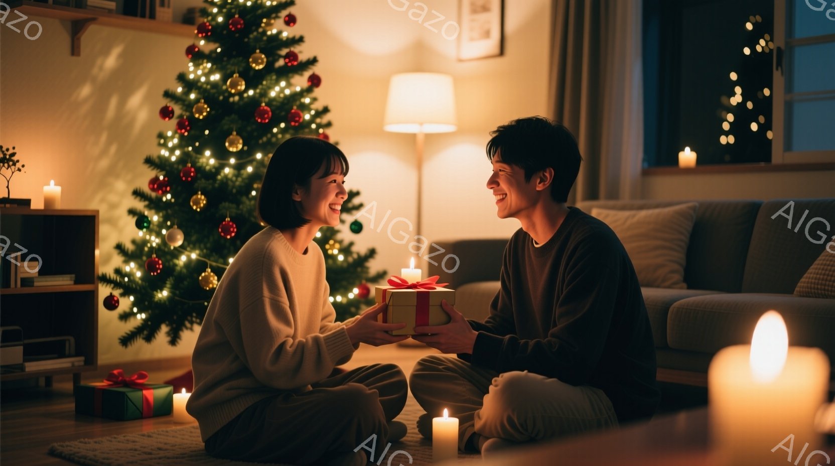 この無料AI生成画像「暖炉の前で、若い男女が手をつないで微笑み合っています。男性は赤いセーターとベージュのズボンを着用し、女性は赤いワンピースを着ています。背景には、クリスマスツリー、プレゼント、そしてキラキラ光る電飾が飾られ、温かくロマンチックなクリスマスの雰囲気が漂っています。」は、2025年10月27日に作成されました。 サイズは 1664×928px の高解像度で、商用利用も可能なフリー素材として提供しています。