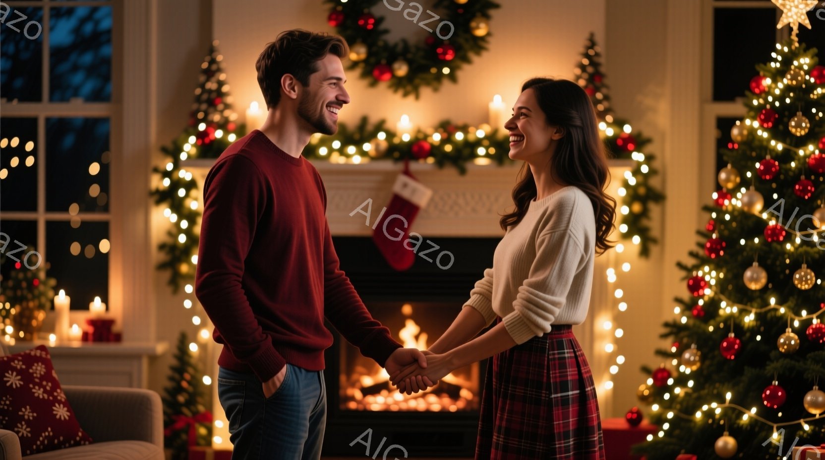 暖炉の前で、若い男女が手をつないで微笑み合っています。男性は赤いセーターとベージュのズボンを着用し、女性は赤いワンピースを着ています。背景には、クリスマスツリー、プレゼント、そしてキラキラ光る電飾が飾られ、温かくロマンチックなクリスマスの雰囲気が漂っています。