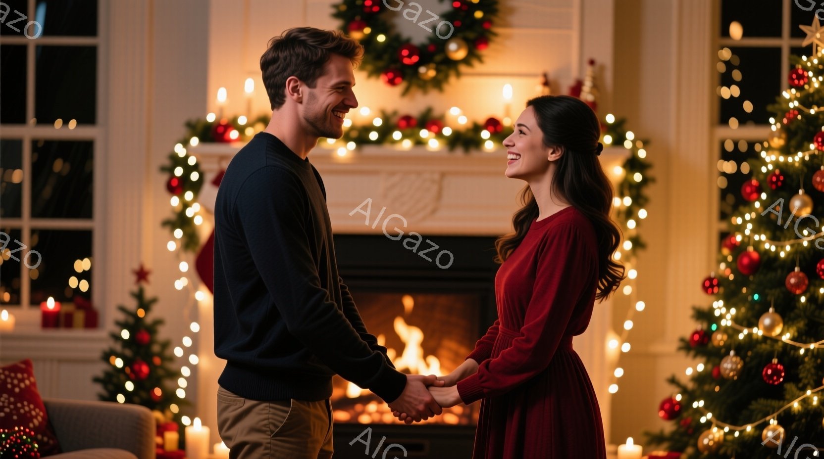クリスマスツリーと暖炉の前で、男女が手をつないで微笑み合っている。男性は赤いセーターとジーンズを着用し、女性は白のセーターとチェック柄のスカートを着ている。背景には、装飾されたクリスマスツリー、暖炉、そして温かい光が溢れ、幸せでロマンチックな雰囲気を醸し出している。