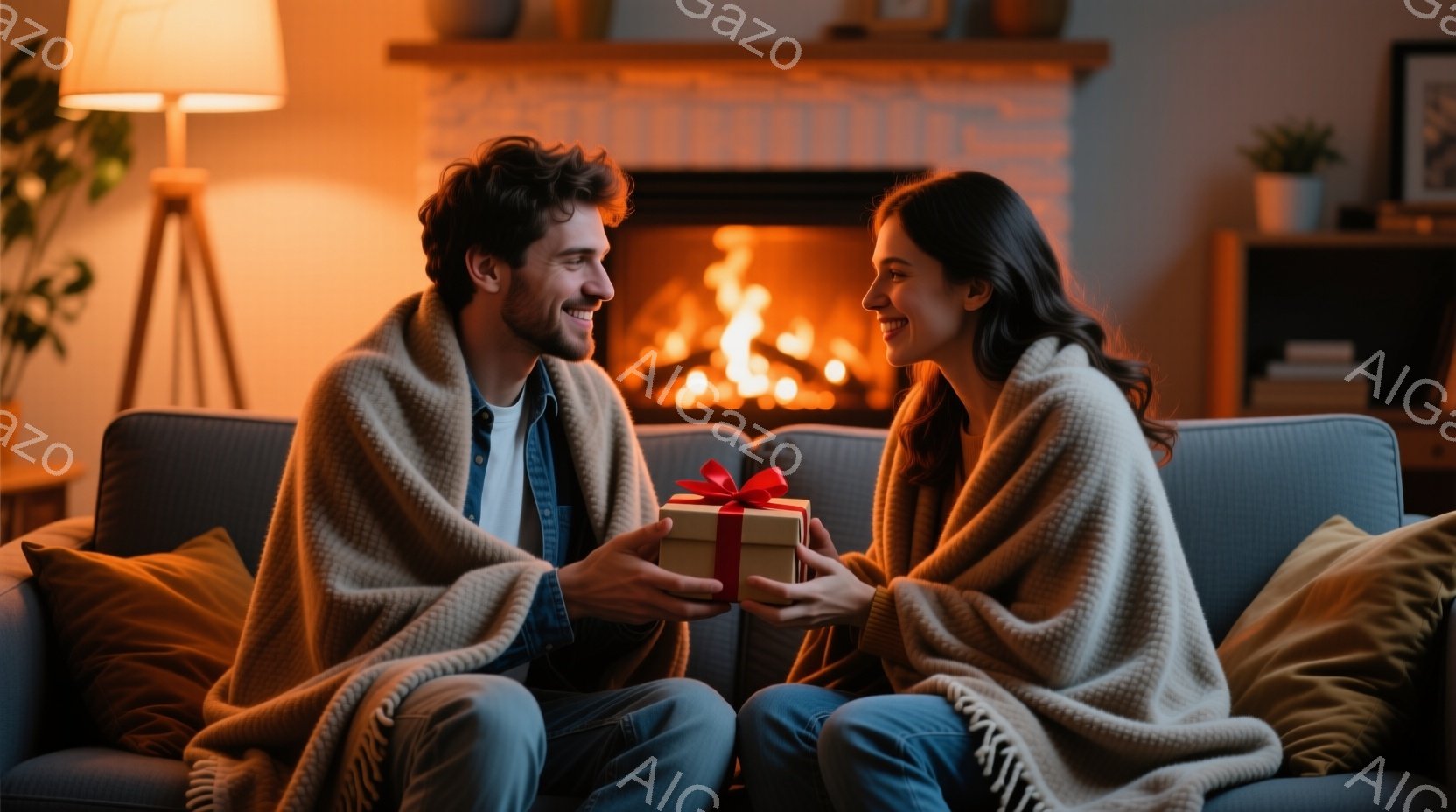 ソファに座った若い男女が、温かい毛布に包まれ、プレゼントを交換し合っている様子が写っています。女性は長い茶色の髪で、笑顔でプレゼントを受け取ろうとしており、男性は笑顔で赤いリボンで飾られた箱を差し出しています。背景には暖炉があり、暖かく居心地の良い雰囲気を醸し出しています。