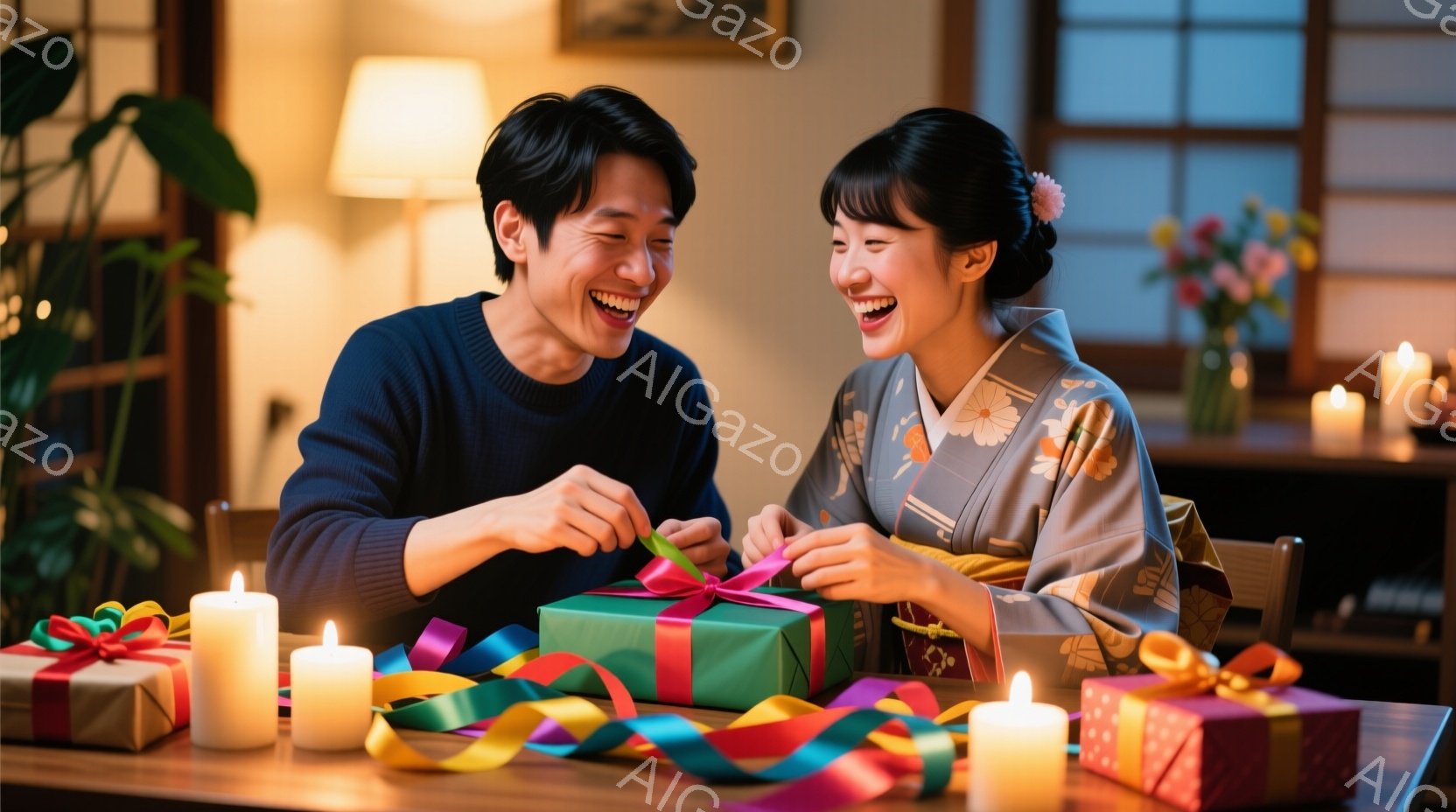 若い男女がプレゼントのラッピングを手伝い合って楽しそうに笑っています。女性はグレーのシャツを着ており、髪は肩にかかる長さで、満面の笑みを浮かべています。背景には椅子とキャンドルが置かれ、温かく親密な雰囲気が漂っています。