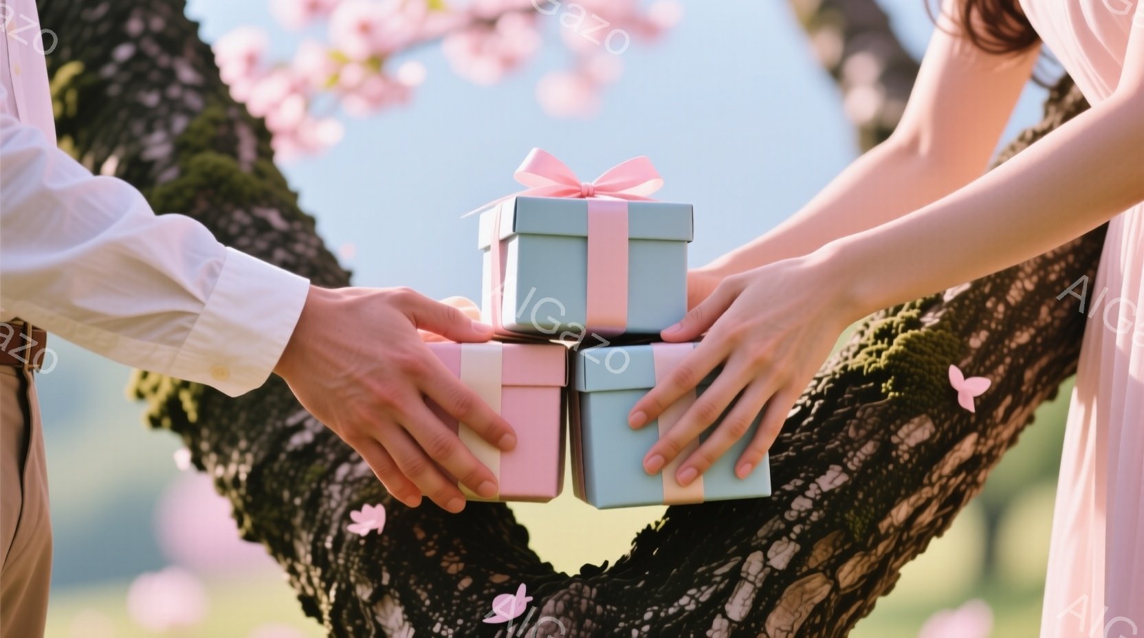 優しいピンクと水色のギフトボックスが、木の幹を背景に並べられ、男性と女性の手によって交換されようとしている。女性は薄いピンク色の袖のある服を着ており、男性は紺色のスーツに白いシャツを着ている。背景は桜の花びらが舞う緑豊かな草原で、春の穏やかな、ロマンチックな雰囲気を醸し出している。