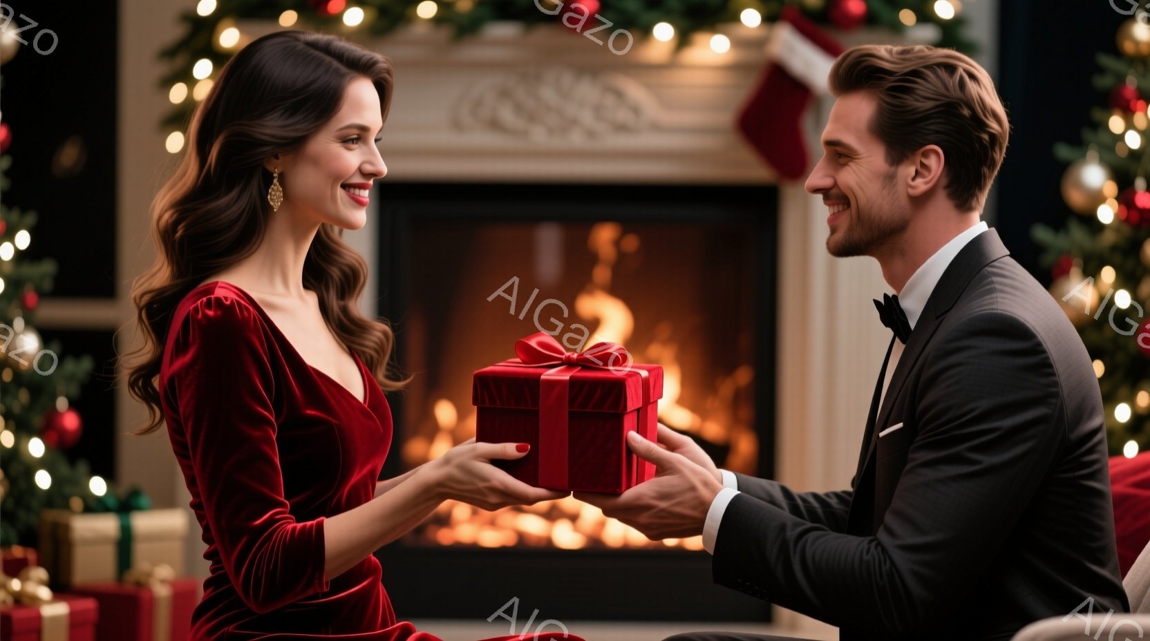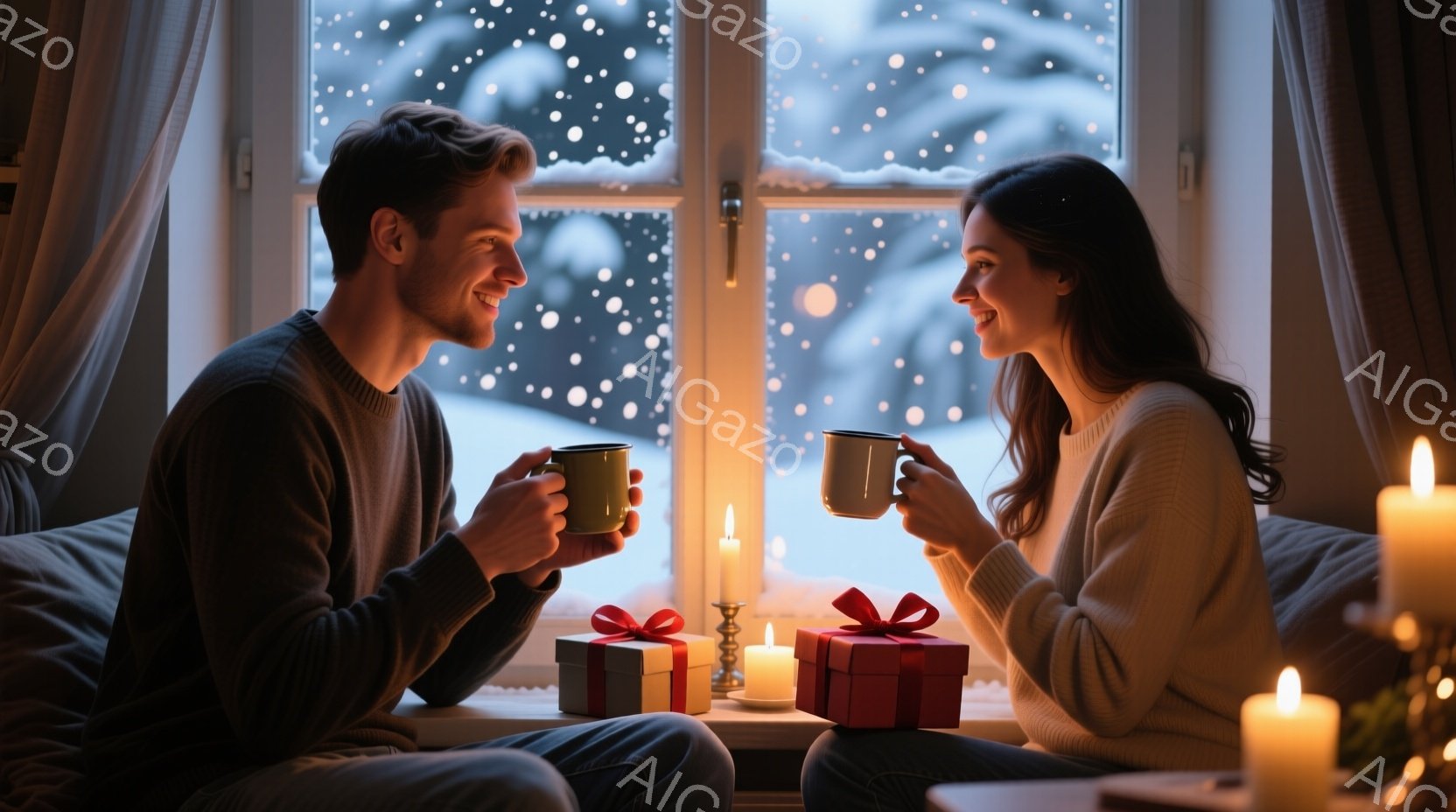窓辺で寄り添う若い男女が、温かい飲み物を手に微笑み合っています。男性は濃い色のセーターを着ており、女性はベージュのニットを着て、ゆるく巻いた髪が肩にかかっています。背景には雪が降り積もる景色と、キャンドルとプレゼントボックスが置かれた心地よい室内が見え、全体的に暖かく、穏やかなクリスマスの雰囲気が漂っています。