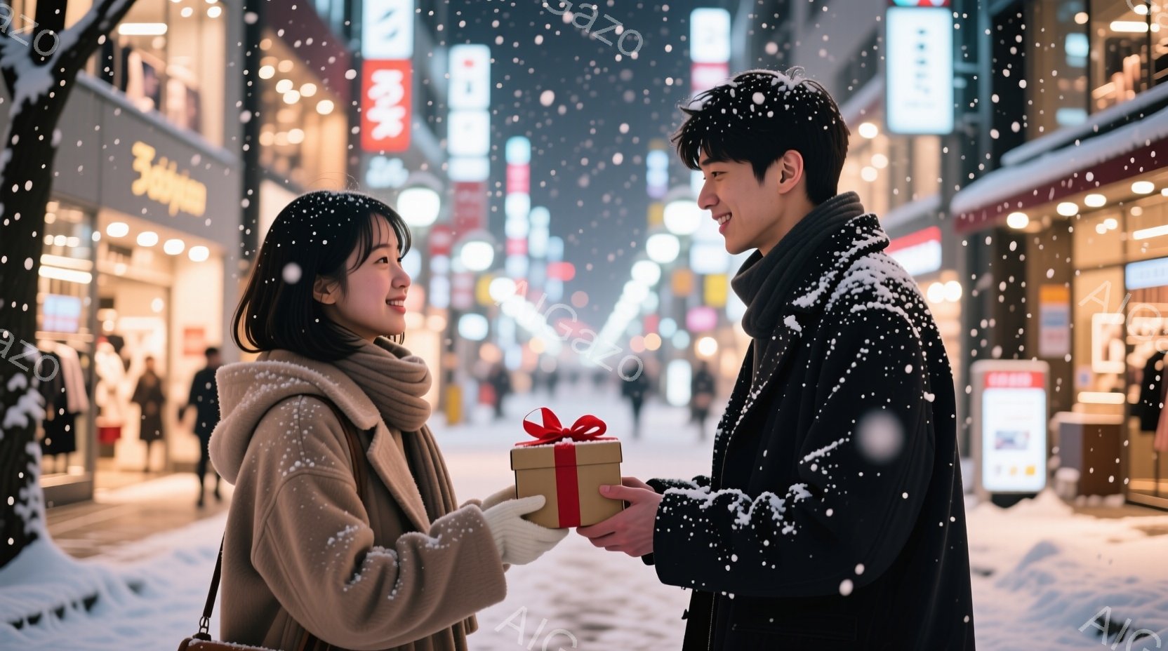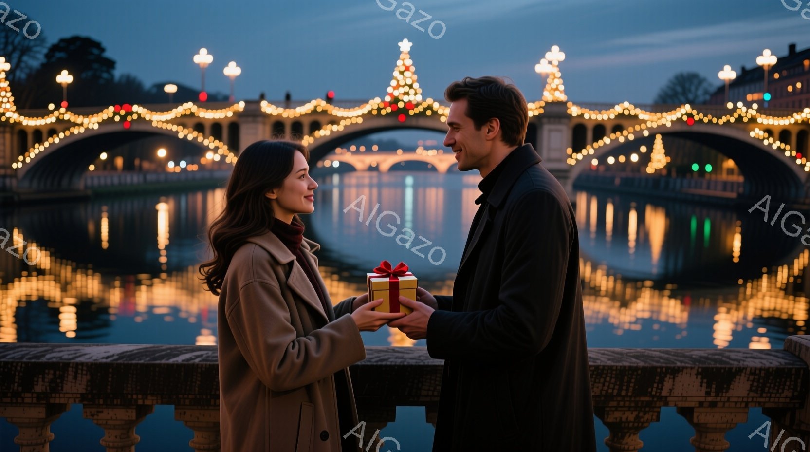 長い茶色の髪をした女性と、濃い色のコートを着た男性が、橋の上でプレゼントを交換しようとしています。男性は女性に赤いリボンで飾られた小さな箱を差し出しており、二人は互いに微笑み合っています。背景には、ライトアップされた橋と水面に反射する光、そして遠くの建物が見え、冬の夜のロマンチックで温かい雰囲気が漂っています。