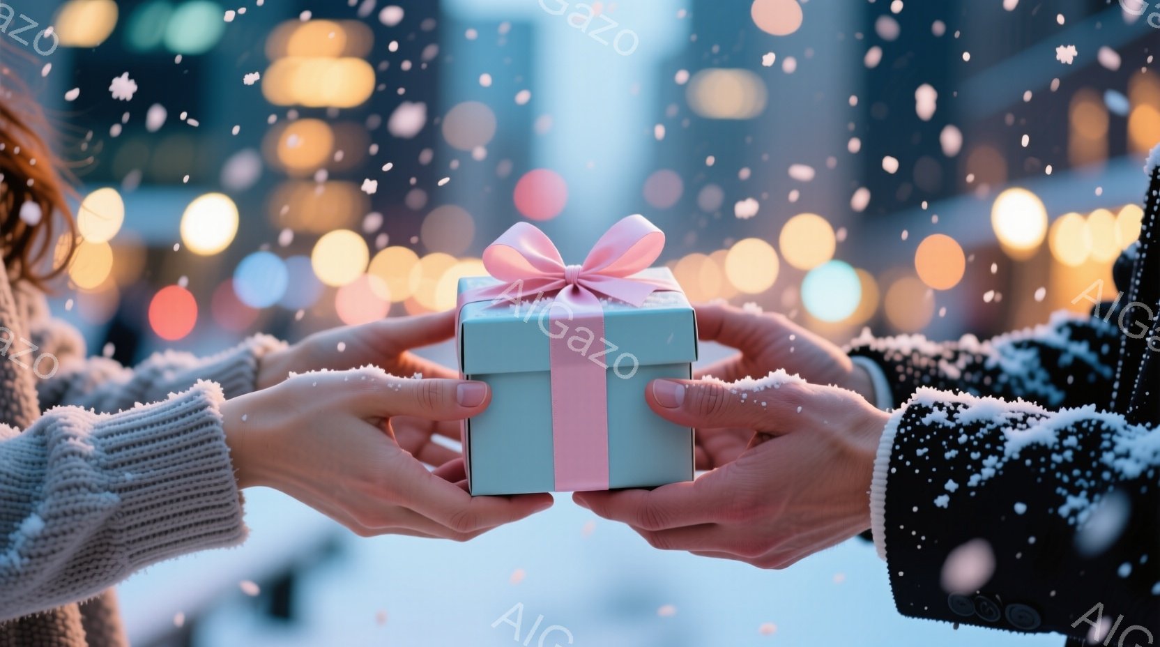 雪が舞う冬の夜、ベンチに寄り添って座る若い男女が描かれています。女性は長い黒髪で、赤いマフラーを巻いて微笑んでいます。男性も黒いコートを着て、女性を見つめながら優しく微笑み、背景には雪に覆われた建物と水面に反射する灯りが暖かく光っています。