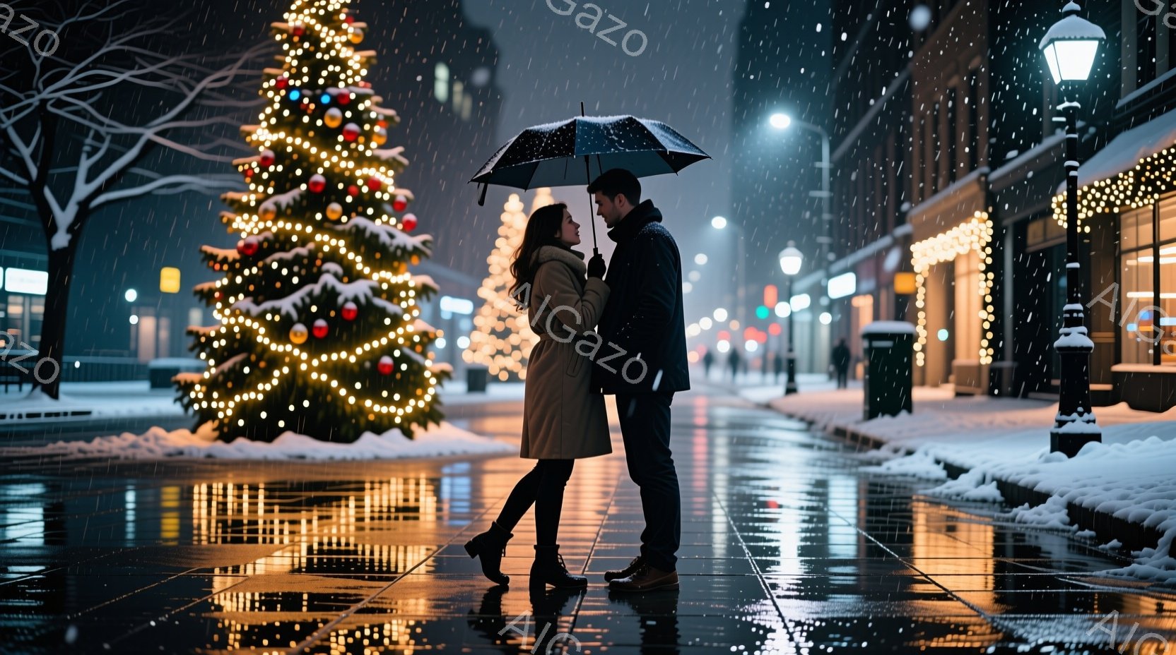 雪が舞う夜の街で、若い男女が寄り添い、傘の下で顔を見合わせています。女性はロングヘアで、濃い色のコートを着ており、男性は黒いジャケットとジーンズ姿です。背景には、カラフルなライトで飾られたクリスマスツリーや建物が並び、ロマンチックで暖かい雰囲気を醸し出しています。