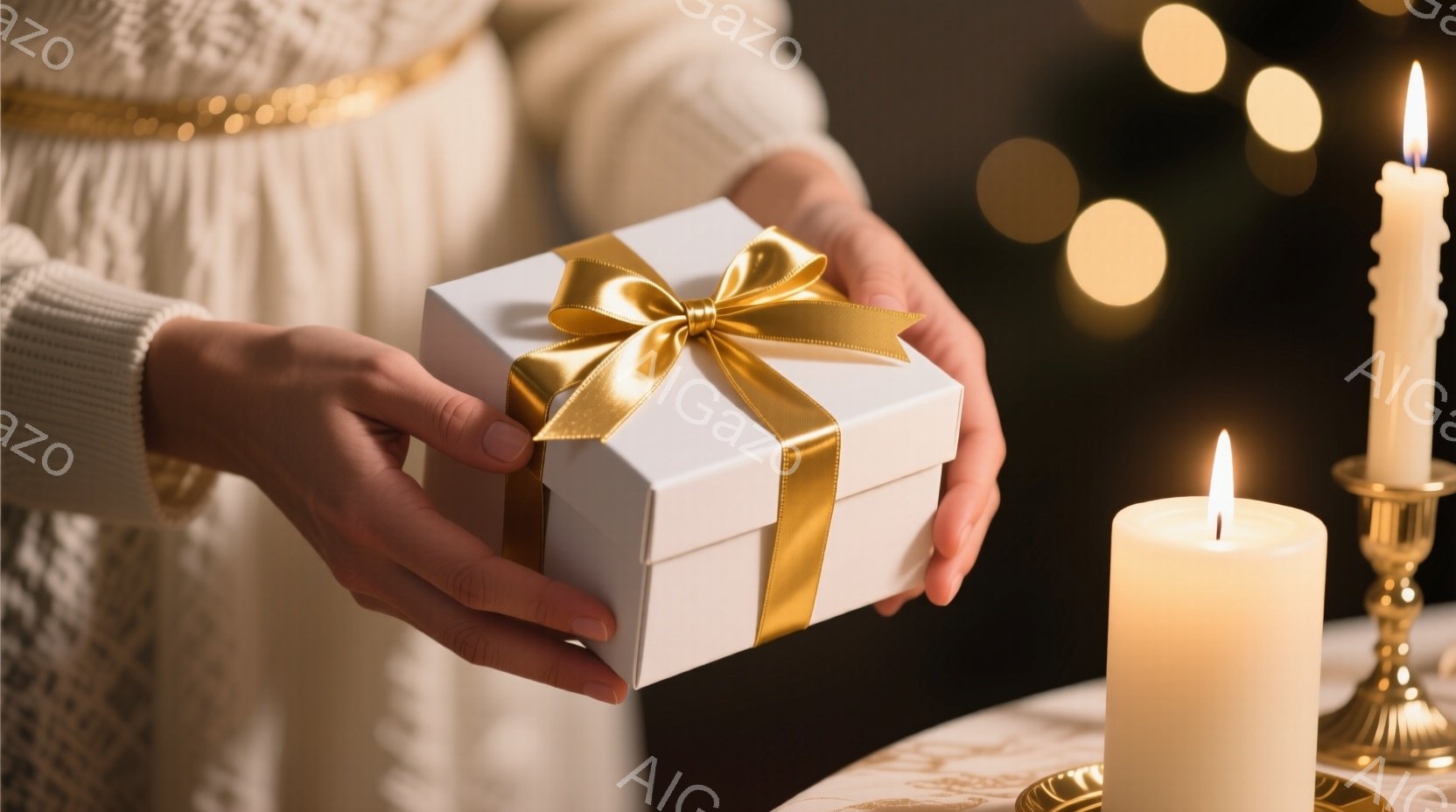 白いセーターを着た女性が、金色のリボンで結ばれた白いギフトボックスを両手で差し出している。背景にはぼんやりとクリスマスの飾り付けが見え、テーブルの上には火の灯るキャンドルが置かれている。全体的に暖かく、穏やかで、贈り物を受け取る喜びを感じさせる雰囲気である。