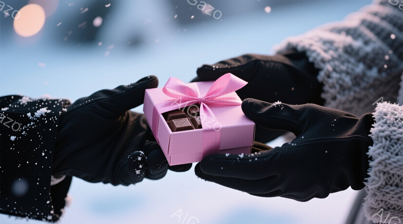 雪が舞う背景で、手袋をはめた手が小さなピンク色のギフトボックスを渡す瞬間が捉えられています。手袋は片方が黒く、もう片方が赤色の毛糸で覆われており、暖かさを感じさせます。背景にはぼんやりとした光のぼかしがあり、冬のロマンチックな雰囲気を醸し出しています。