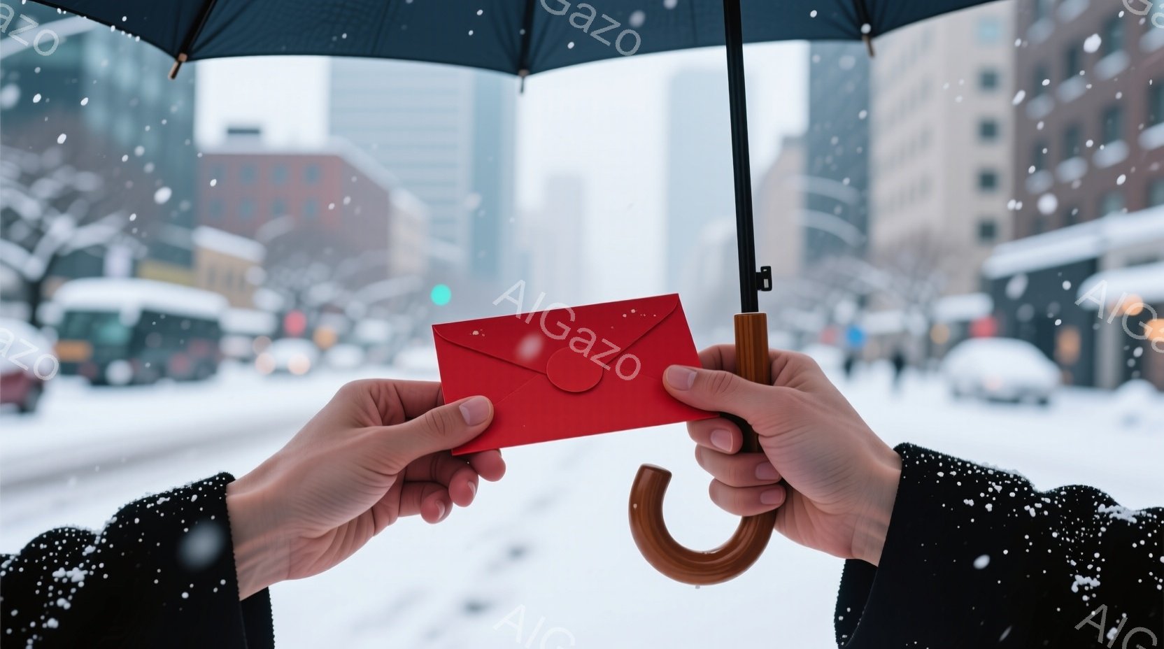 雪が降り積もる都会の風景の中で、一人が赤い封筒を別の人物に渡そうとしている様子が捉えられています。手元には黒いコートとビジネスマンらしい服装が見え、雪景色の中、静かで落ち着いた雰囲気が漂っています。背景には高層ビル群が立ち並び、冬の都市の寒さと静寂を強調しています。