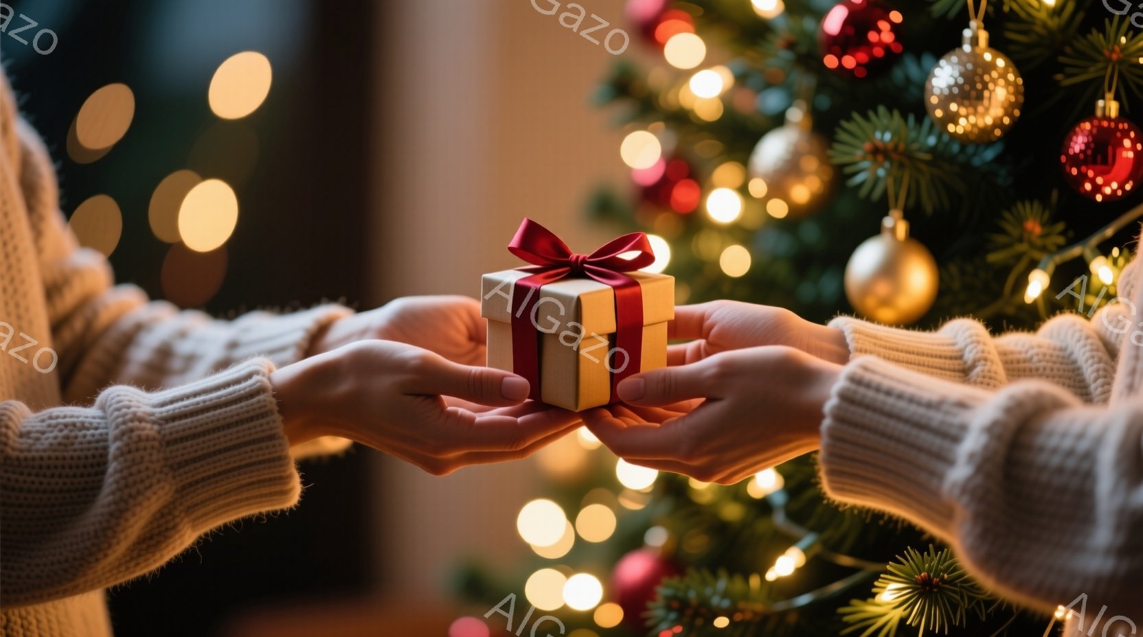 温かいベージュ色のセーターを着た二人の手が、白いギフトボックスを互いに向かい合わせています。ギフトボックスは赤いリボンで美しく飾られており、ホリデーシーズンを象徴しています。背景には、ぼんやりと光るクリスマスツリーと暖炉が見え、温かく幸せな雰囲気が漂っています。