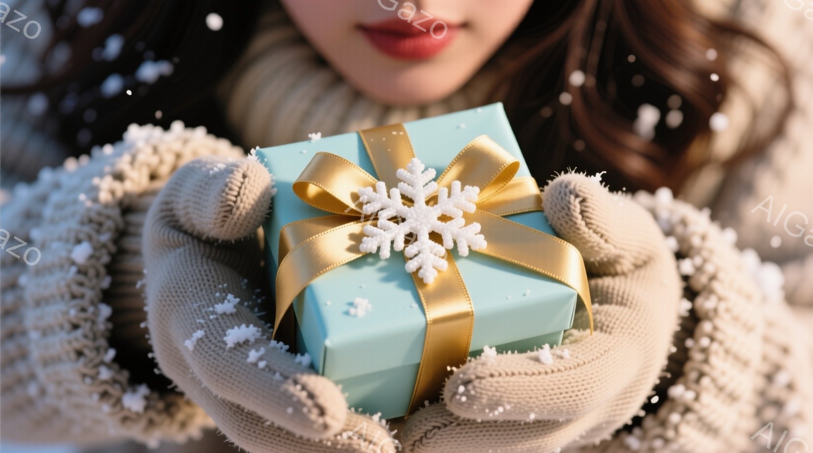 長いダークブラウンの髪を持つ女性が、ピンク色のギフトボックスを白いポンポン付きの手袋で抱えています。ギフトボックスは金色のリボンと白い雪の結晶の飾りで飾られています。背景は雪が舞う冬の風景で、暖かく優しいクリスマスの雰囲気が漂っています。
