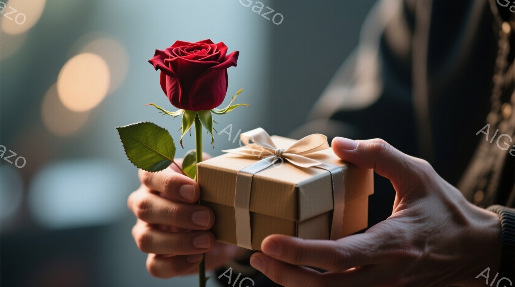 片手には深紅のバラ、もう片手にはリボンで結ばれた小さなギフトボックスが握られています。背景はぼかされており、室内であることと、窓からの光が差し込んでいることがわかります。全体的に、ロマンチックで、贈り物をする、または受け取る心温まる瞬間を捉えた雰囲気です。