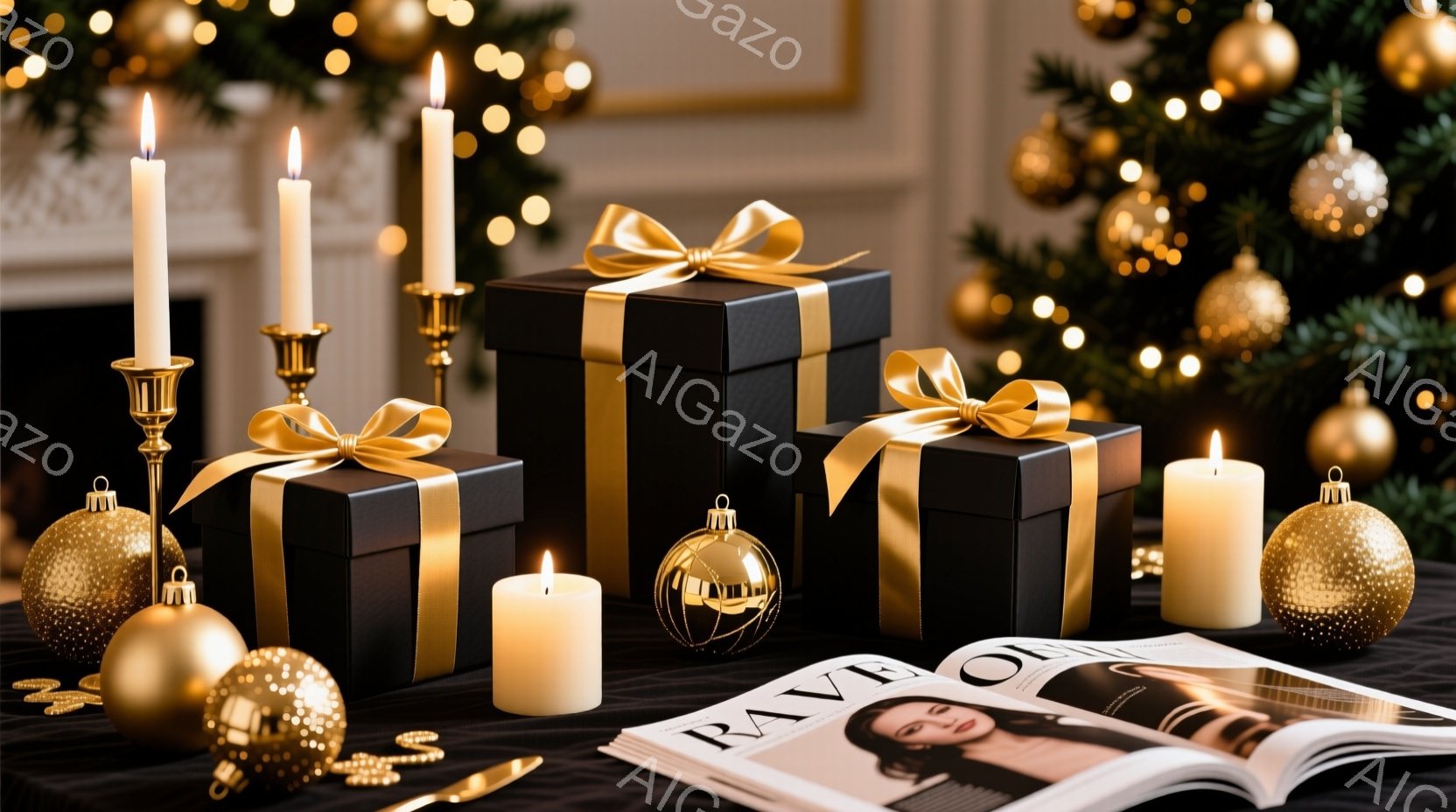 黒い背景に、金色のオーナメントやギフトボックス、キャンドルが配置された静物画です。ギフトボックスには金色のリボンが結ばれており、豪華な雰囲気を醸し出しています。雑誌も一部見えており、全体的に洗練された、ホリデーシーズンの贅沢な空間を表現しています。
