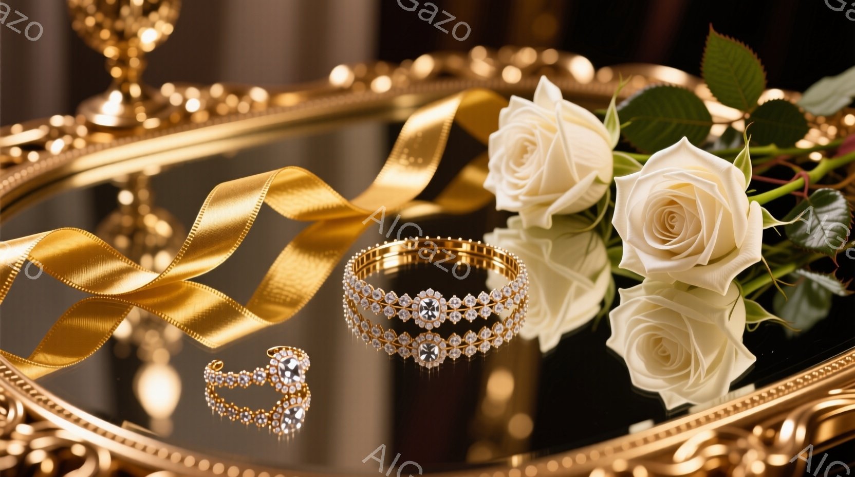 豪華な黒い装飾が施されたトレーの上に、白いバラと宝石がちりばめられた金色のブレスレットが配置されています。鮮やかな緑色の宝石がアクセントとなり、バラの花びらと金色の輝きが互いに引き立て合っています。全体的に優雅で洗練された雰囲気が漂い、特別な贈り物や装飾品を想起させます。