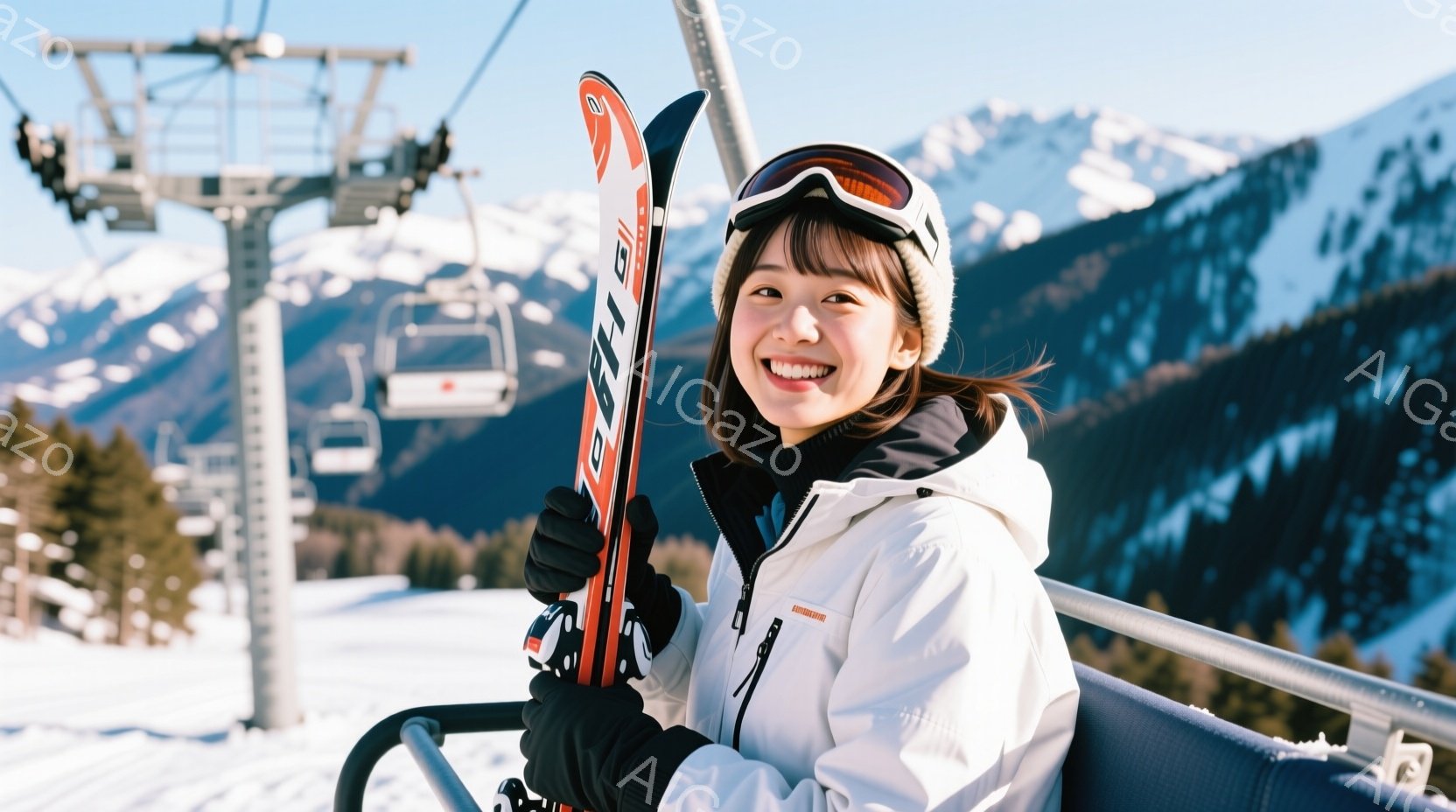 彼女はスキー場のリフトに乗っており、白いスキーウェアと黒い手袋を着用し、頭には黒いヘアバンドとゴーグルをつけている。 彼女は満面の笑みを浮かべ、片手にスキーを持ってリラックスした様子で座っている。 背景には雪を抱いた山々が広がり、晴天の下、冬のスキーを楽しむ活気ある雰囲気が感じられる。