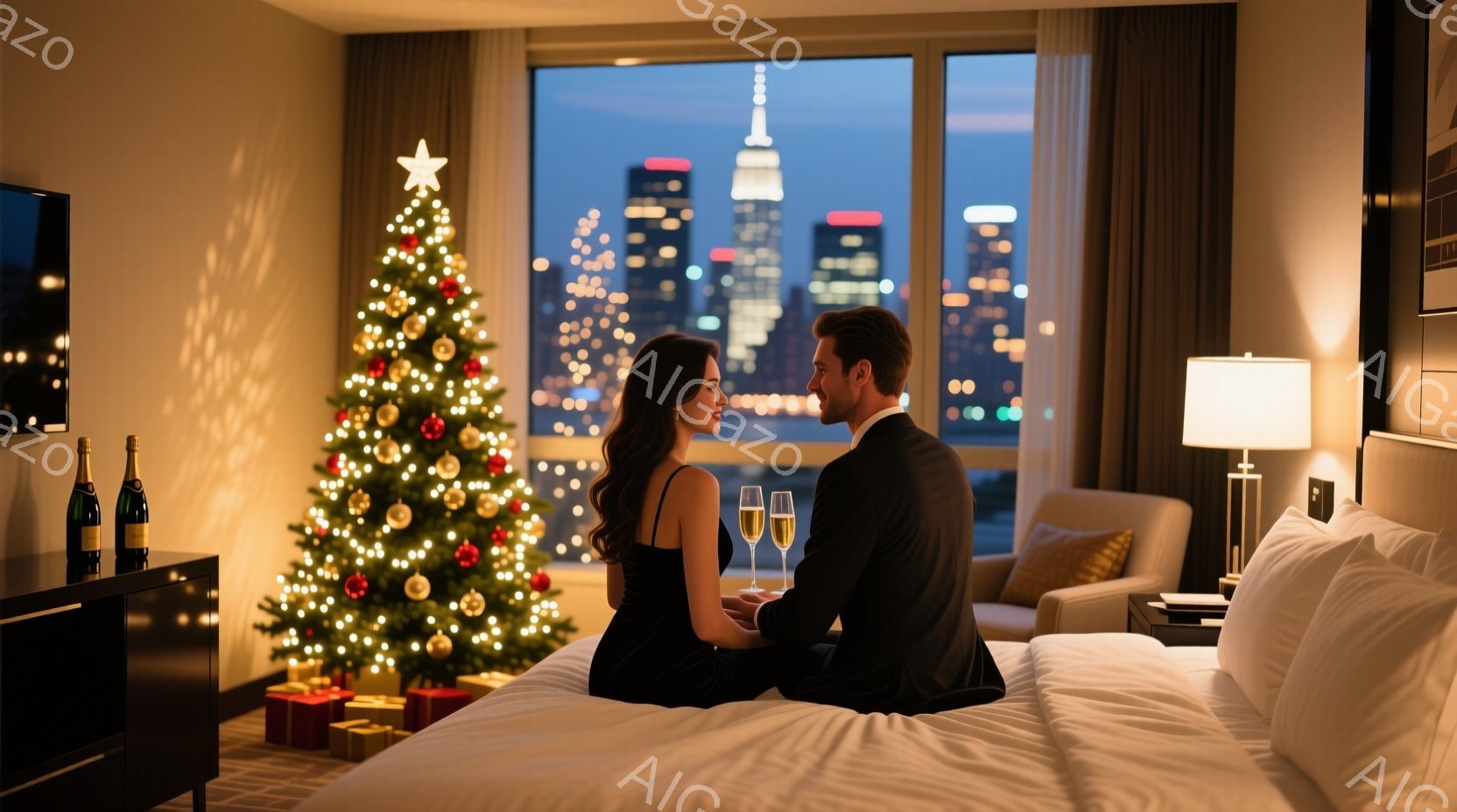 クリスマスツリーが飾られた豪華なホテルの部屋で、一対のカップルがベッドに座り、シャンパンを片手に微笑み合っています。女性は白いドレスを着用し、長い髪を下ろしています。背景には夜景の摩天楼が広がり、クリスマスの温かくロマンチックな雰囲気を醸し出しています。
