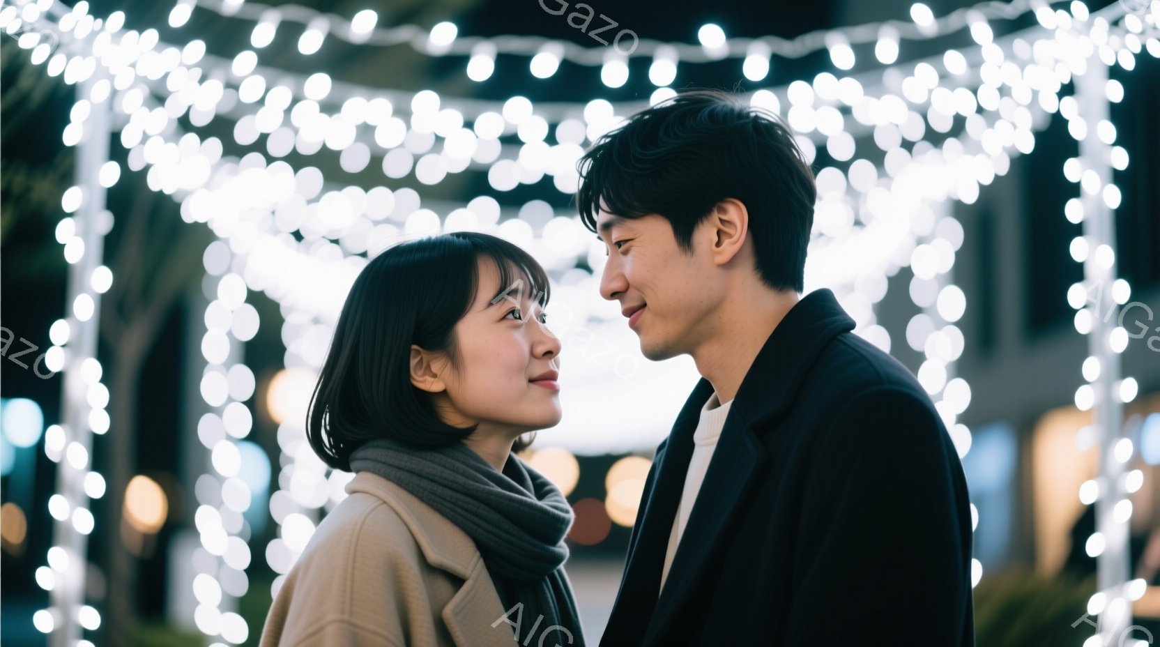 若い女性と男性が、光のトンネルの中で向き合っている。女性は短い茶色の髪で、ベージュ色のコートを着ており、男性は黒髪で、灰色のマフラーを巻いている。二人は少し顔を上げ、互いを静かに見つめ合い、温かく、ロマンチックな雰囲気が漂っている。