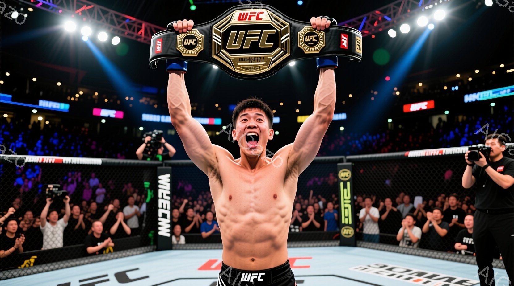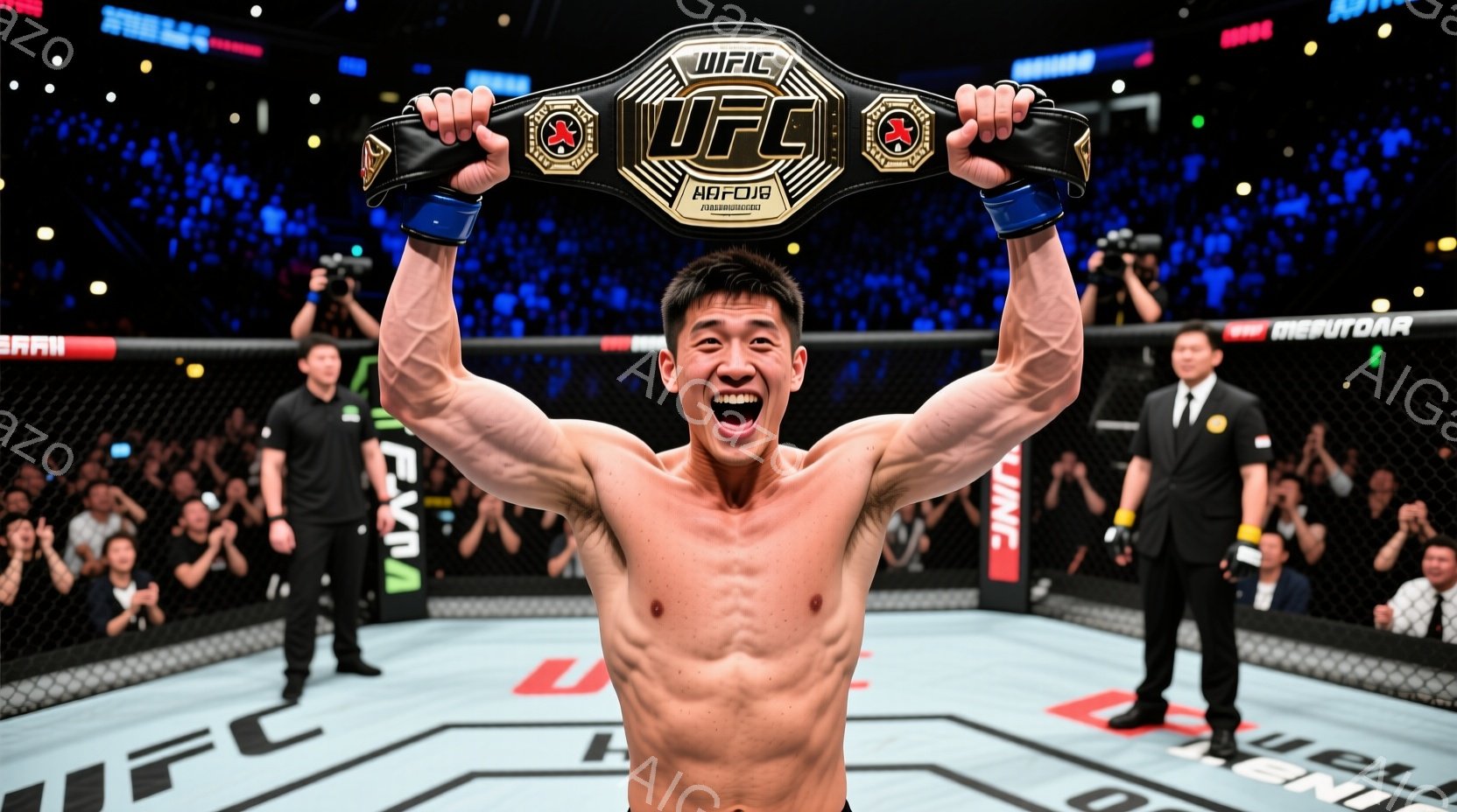 鮮やかな照明が照らすUFCのオクタゴン中央で、アジア人男性が勝利を喜んでいます。彼は上半身を裸にし、赤い手袋を着用し、勝利を象徴する金色のチャンピオンシップベルトを高々と掲げ、満面の笑みを浮かべています。観客席は観客で埋め尽くされ、興奮と熱狂に包まれた、勝利の瞬間を捉えた写真です。