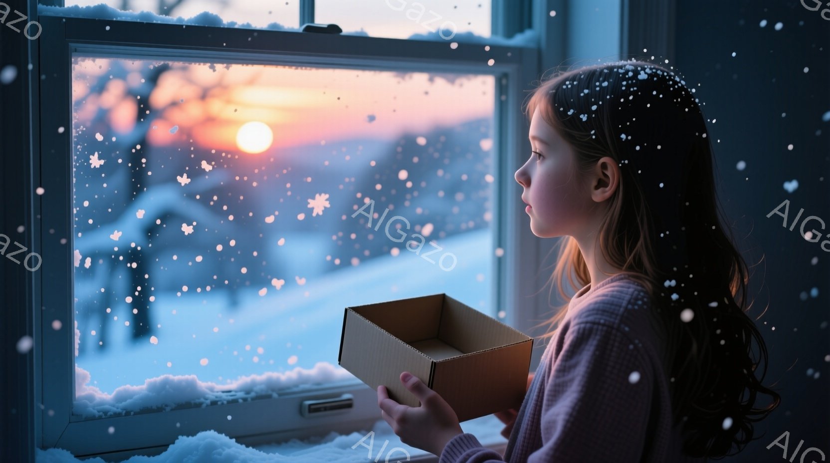 雪が降る冬の日に、窓辺に立つ少女が描かれている。彼女はグレーのセーターを着ており、髪は長く、自然なカールがかかっている。彼女は小さな段ボール箱を持っており、外の雪景色を見つめている、物思いにふける表情をしている。