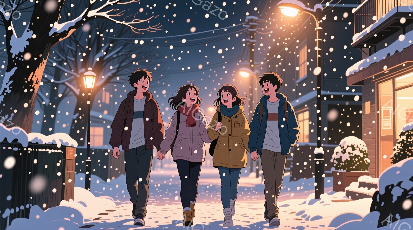 雪が降る夜の街を、リュックを背負った若い男女5人が並んで歩いている。彼らはそれぞれピンク、赤、黄色、青、紫の明るい色のジャケットやコートを着ており、表情は穏やかで楽しげだ。背景には雪で覆われた建物や木々が見え、温かい街灯の光が雪景色を照らし、冬の温かくほっとする雰囲気を醸し出している。