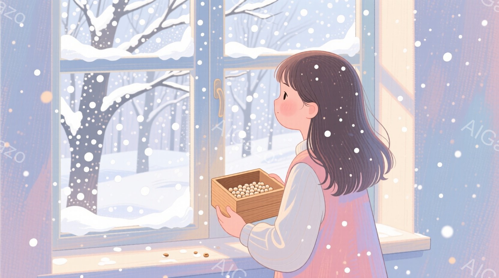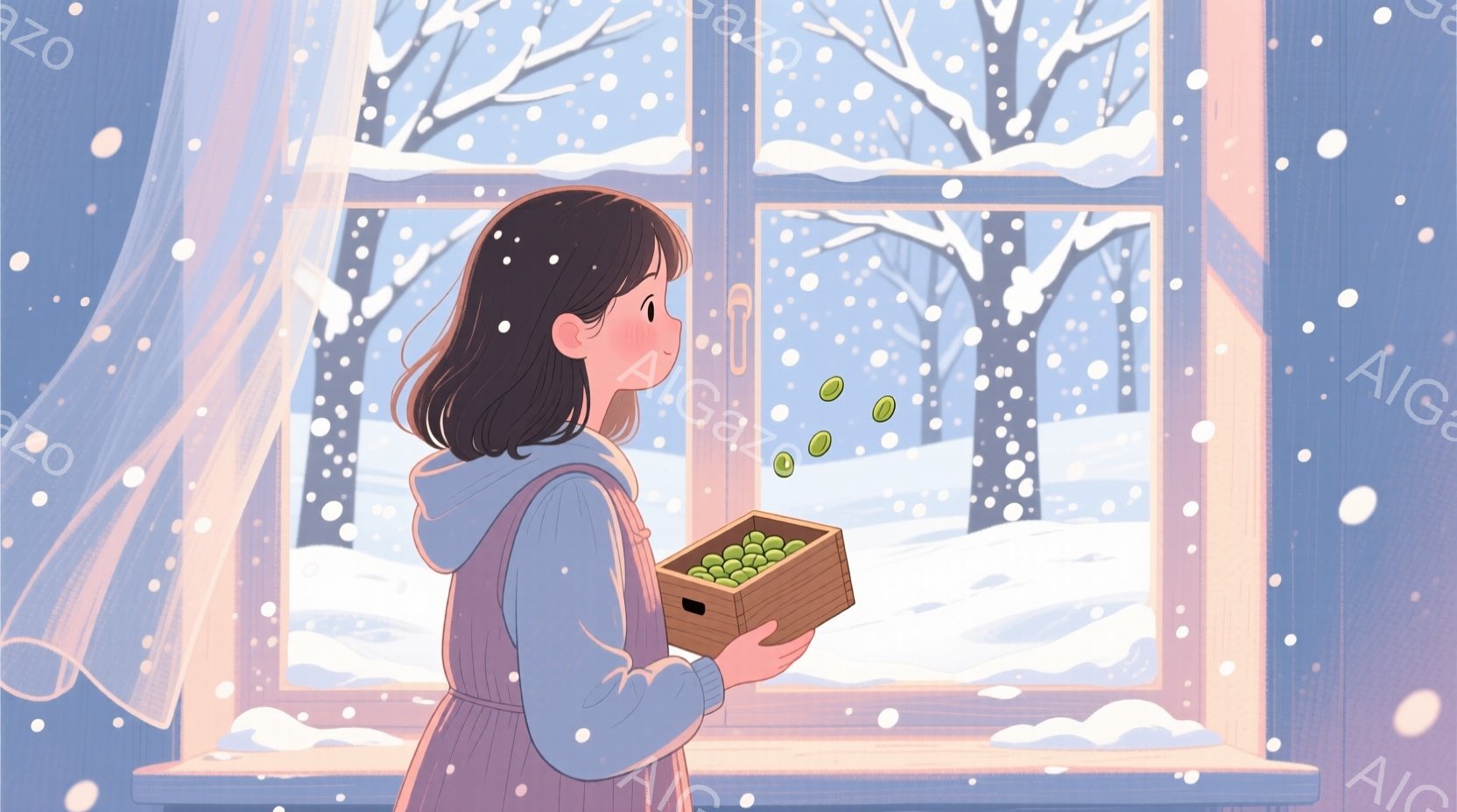 茶髪の少女が窓辺に立ち、小さな木箱を手に持っています。彼女は白いセーターを着ており、髪は肩まで伸びて少しカールしています。窓の外は雪景色で、遠くには木々が見え、静かで穏やかな冬の雰囲気が漂っています。