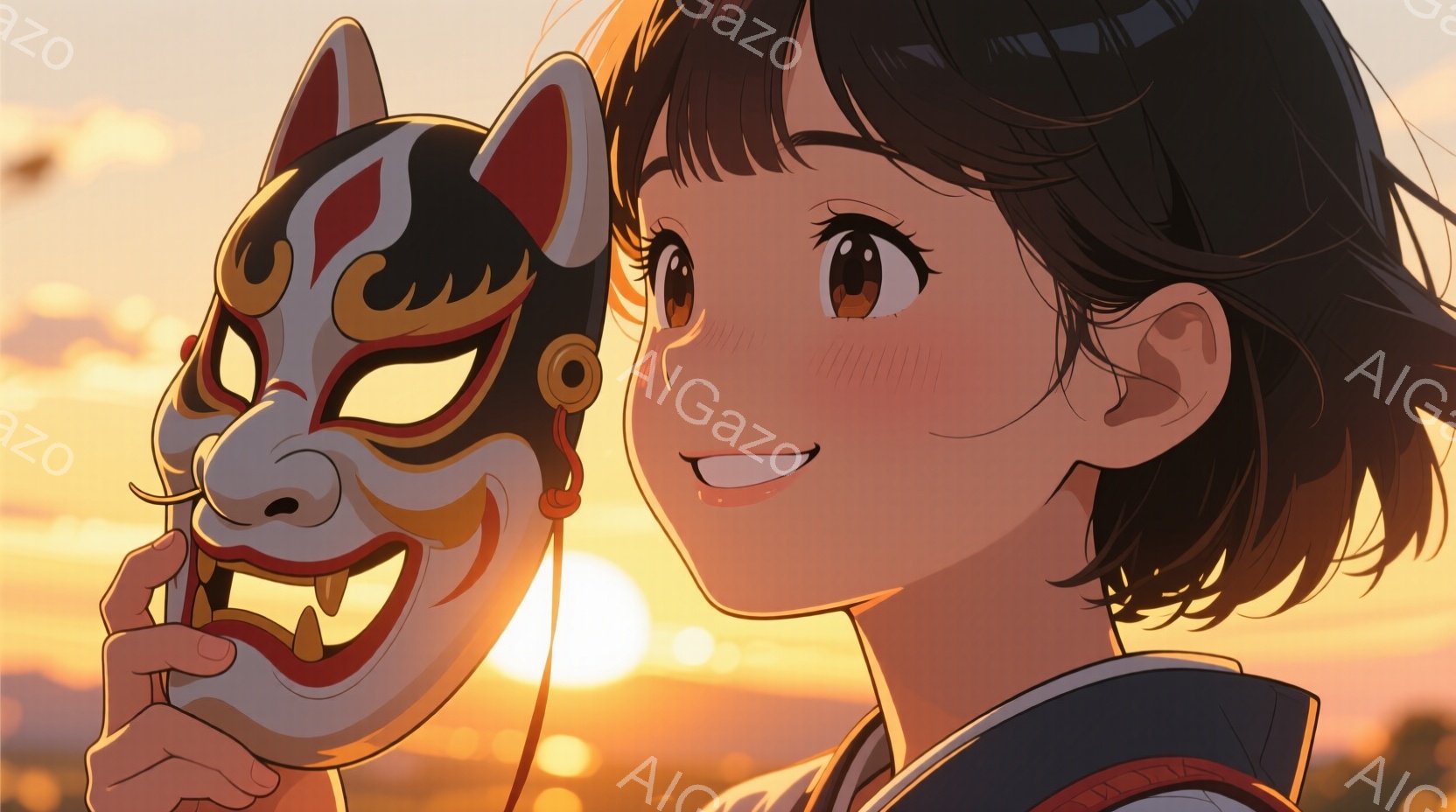 少女は微笑みながら狐の面を手に持っています。彼女は黒髪を後ろでまとめ、藍色の着物に身を包んでいます。背景には夕焼け空と、遠くに見える建物や木々があり、温かく穏やかな雰囲気を醸し出しています。
