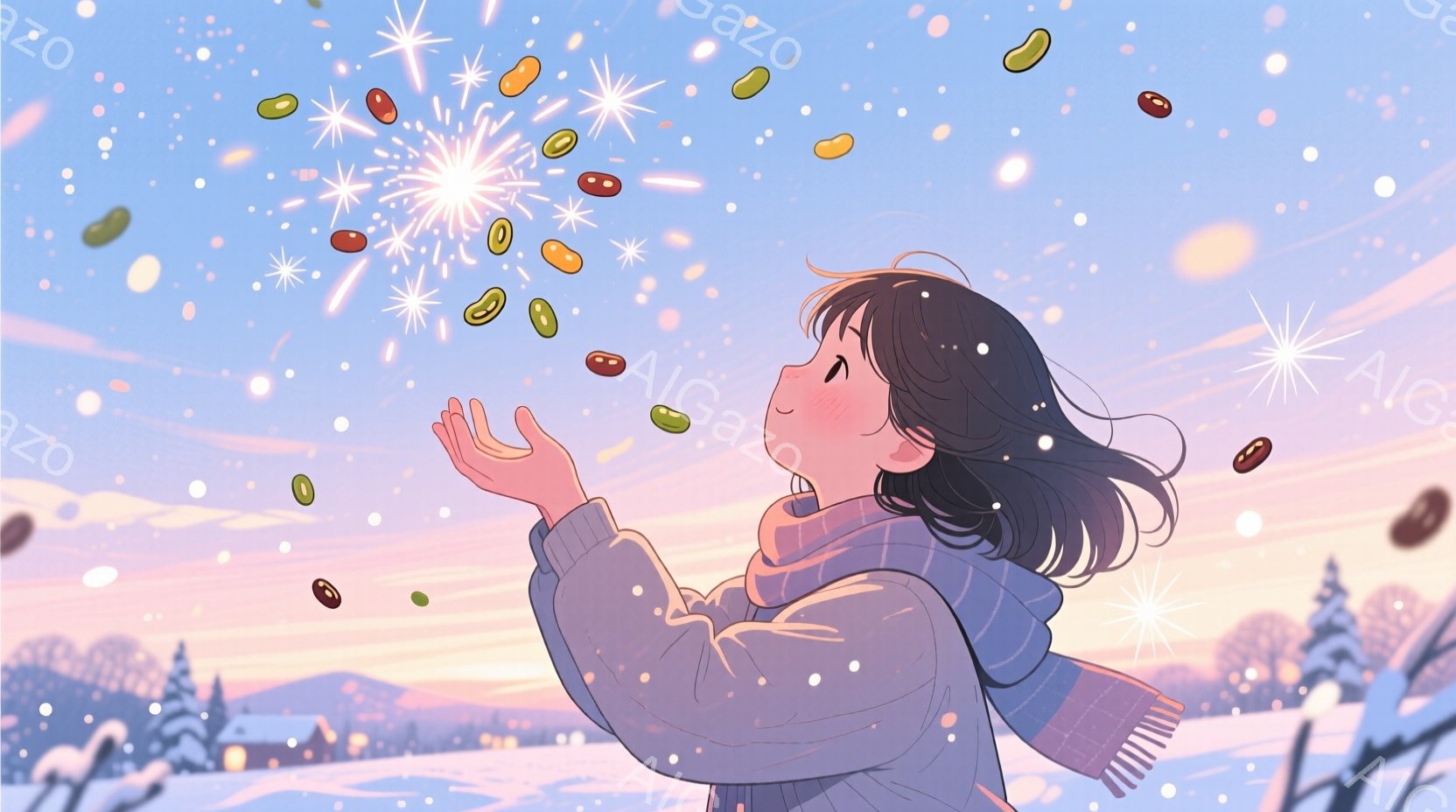 長い黒髪の少女が、雪が舞う中で空を見上げています。彼女はピンク色のマフラーを首に巻き、白いコートを着ており、楽しそうな表情で空から降る小さな光の粒(豆のようにも見える)に手を伸ばしています。背景には雪に覆われた木々や、夕焼け空が広がり、暖かく幻想的な雰囲気が漂っています。