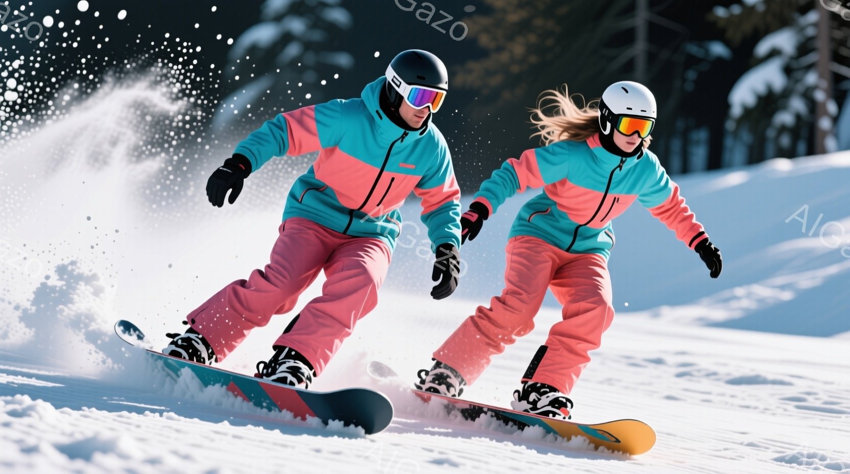 スノーボードを楽しむ男女が写っています。男性は濃い青色のジャケットとズボンを着用し、女性は青いジャケットにピンク色のズボンを着用しています。二人は雪上を疾走し、スノーボードから雪が舞い上がっており、背景には雪山とスキーリゾートの建物が見えます。