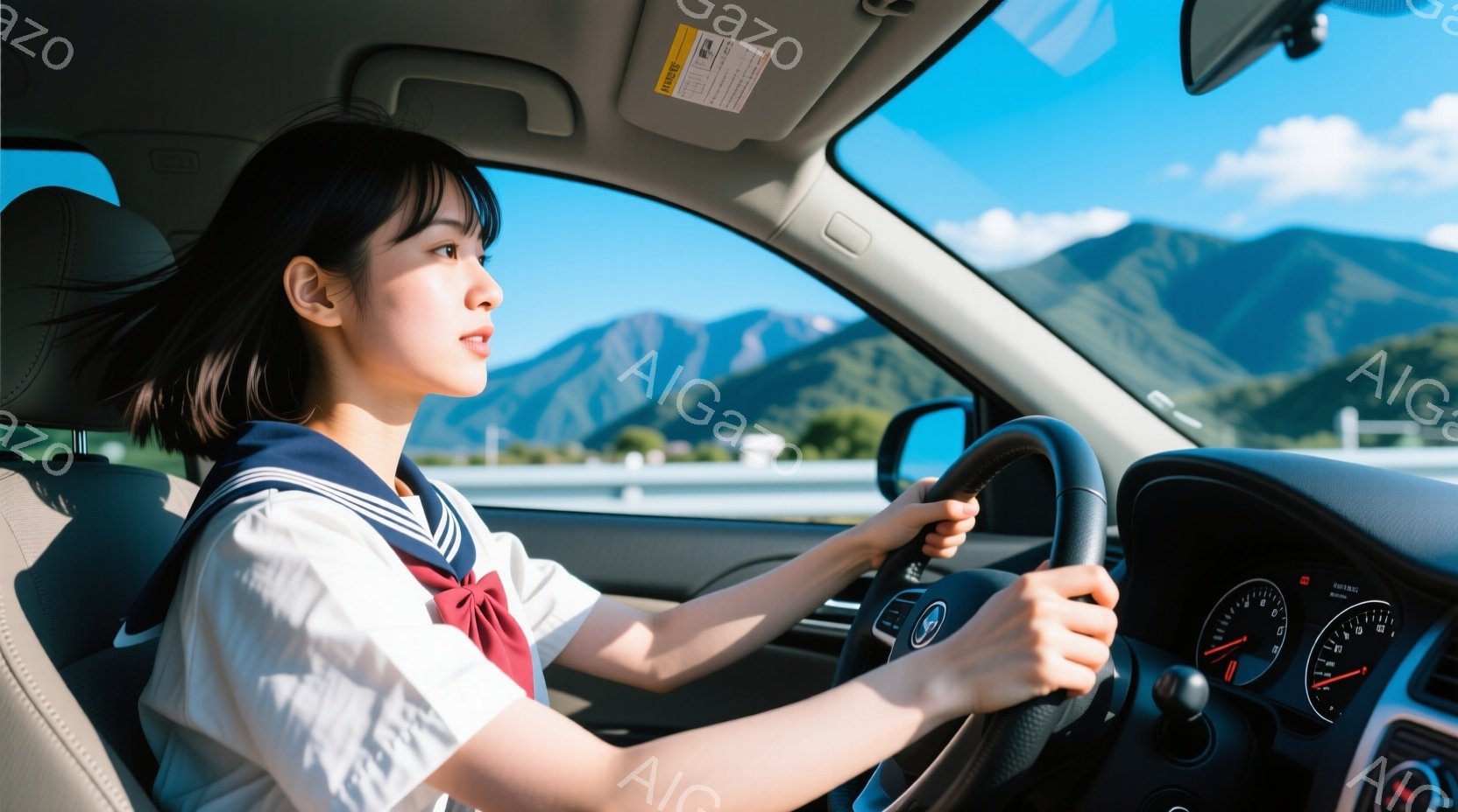 若い女性が運転席でハンドルを握り、前方を向いて運転している。彼女は白いブラウスと紺色のセーラー服を着ており、髪は肩にかかる長さで、少し微笑んでいるように見える。背景には晴れた空と山々が広がり、開放的な雰囲気を感じさせる。