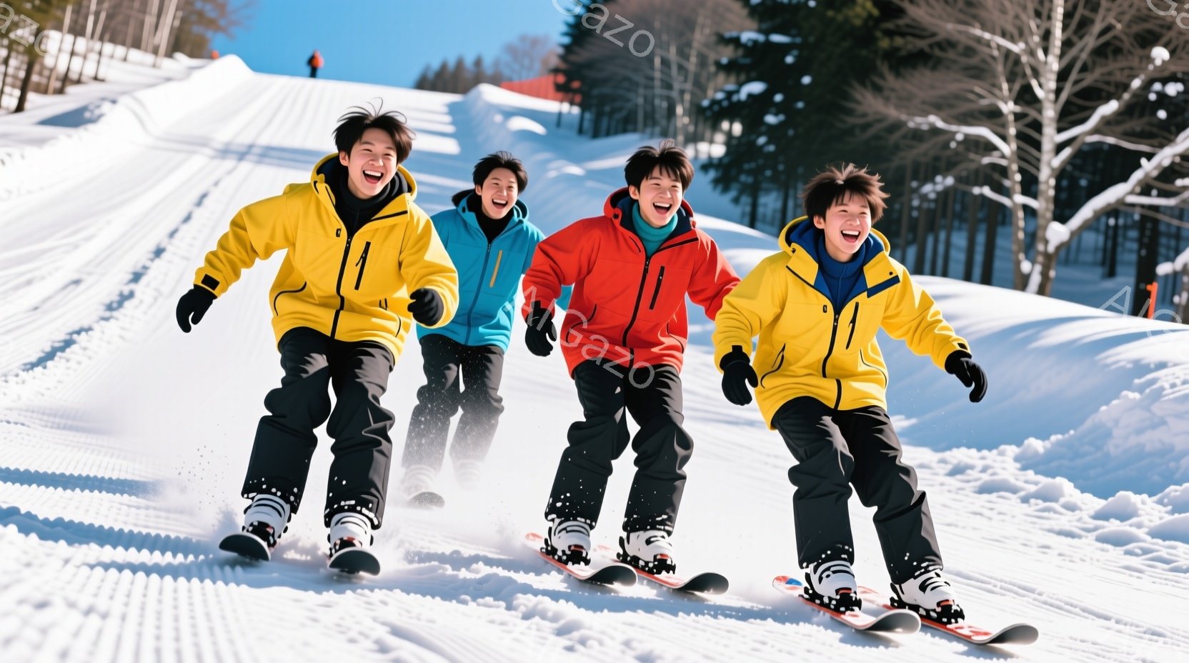 雪山を滑走する4人の子供たちが写っている。赤、オレンジ、青、黄色とそれぞれ異なる色のスキーウェアを着用し、全員笑顔で前を見据えている。背景には白い雪と木々が広がり、晴天のスキー場という冬の雰囲気が伝わってくる。