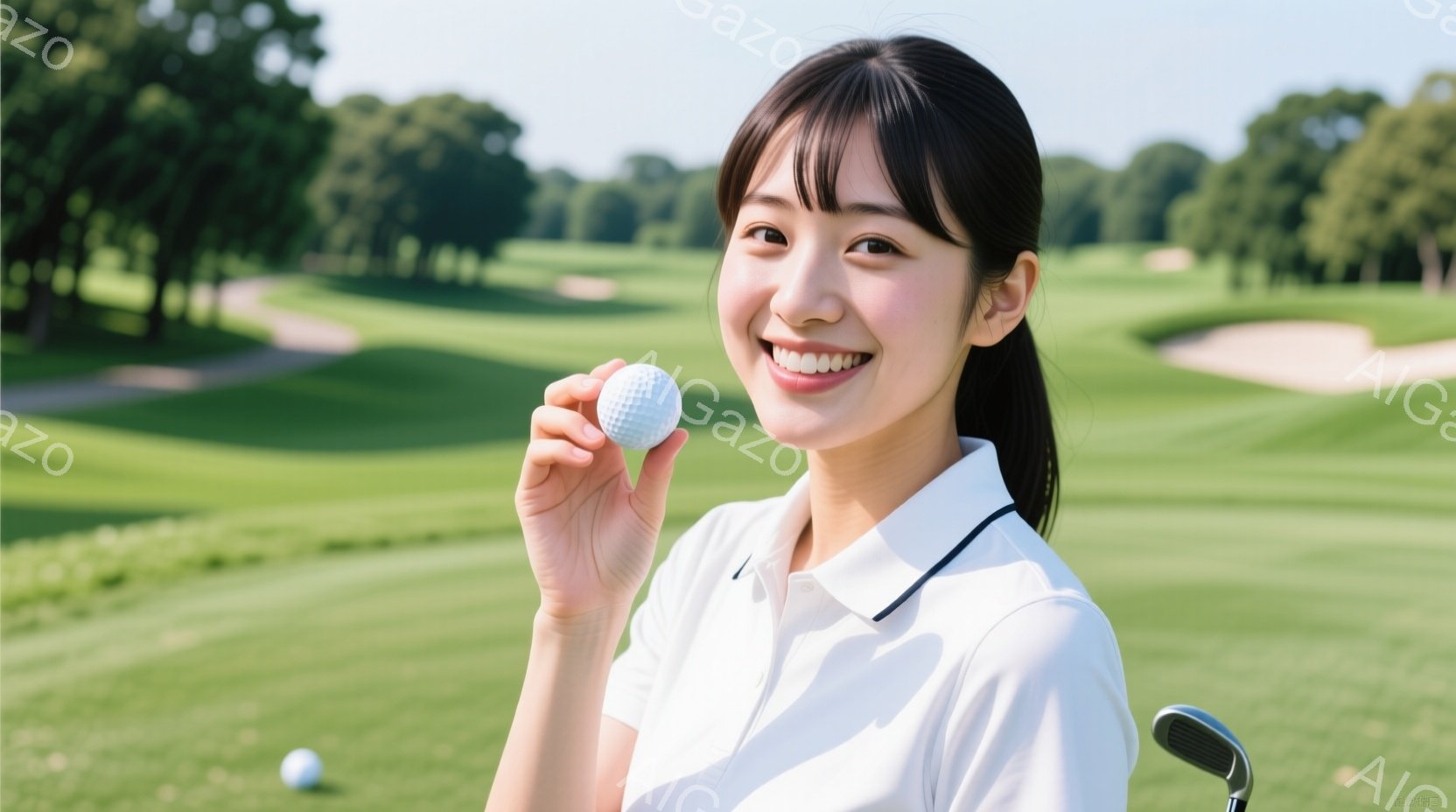 若い女性がゴルフボールを手に笑顔でこちらを見ている写真です。白いポロシャツに髪は後ろでポニーテールにしており、明るい表情で健康的です。背景には緑豊かなゴルフコースが広がり、晴天の下、青々とした芝生と旗が確認できます。