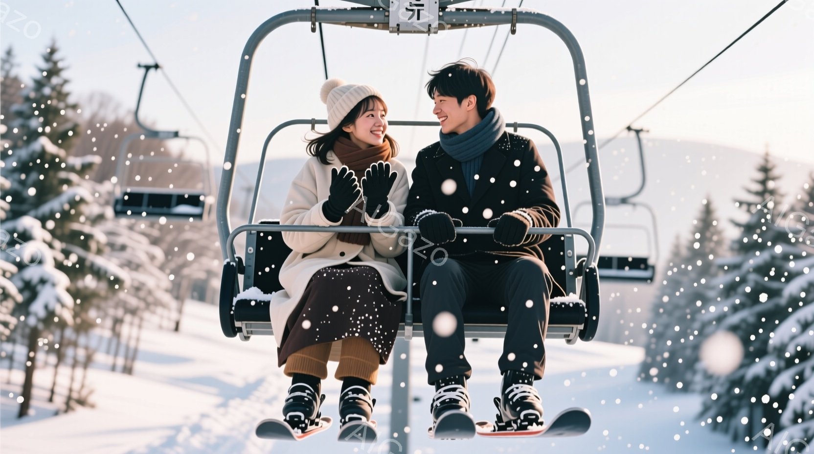 スノーボードが並べられたデッキで、3人の若者がコーヒーを飲みながら楽しそうに談笑している。日差しが降り注ぎ、背景には雪をまとった山々が連なり、冬の暖かな午後のような穏やかな雰囲気が漂っている。彼らはカジュアルな冬物ウェアを身につけ、リラックスした表情でくつろいでいる。
