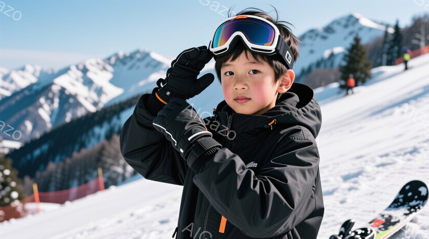 少年は黒のスキーウェアとゴーグルを着用し、雪山を背景にポーズをとっています。彼は片手を上げており、真剣な表情でカメラを見ています。背景には雪に覆われた山々とスキーコースがあり、晴天で明るい雰囲気です。