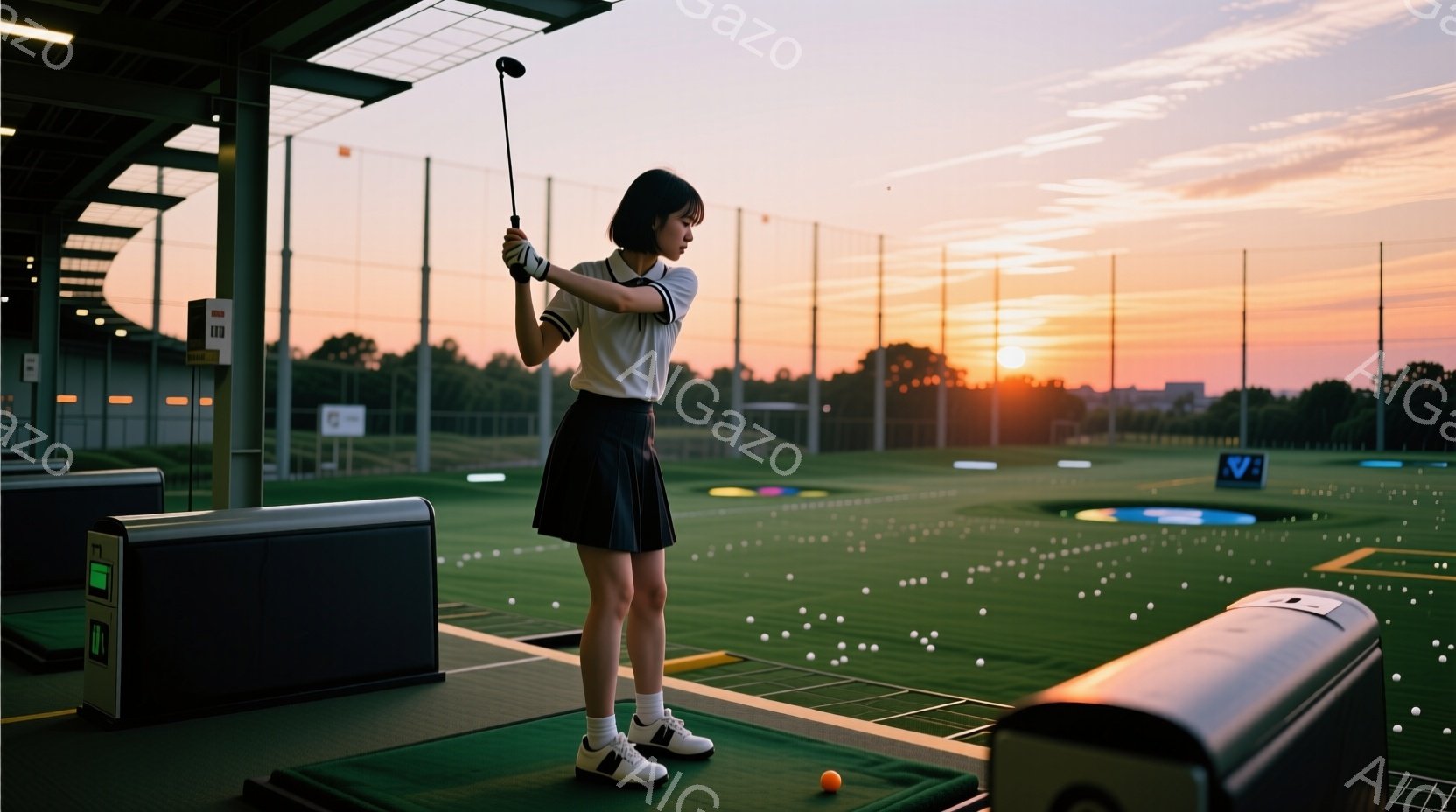 練習場にいる若い女性がゴルフのスイングをしている様子が写っている。白いTシャツと紺色のスカート、白いスニーカーを着用し、髪は後ろで一つに結んでいる。背景には緑の芝生とゴルフボールが散らばり、夕焼け空が広がっており、穏やかで集中した雰囲気が漂う。
