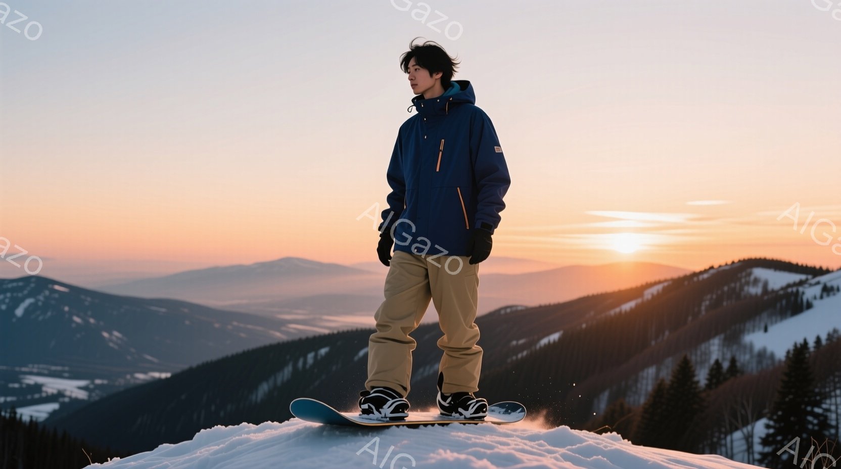 スノーボードに立った男性が、夕焼けに照らされた山頂に立っている。彼は濃い青色のジャケットとベージュ色のズボンを着用し、黒髪を無造作にしている。背景には、雪を抱いた山々が連なり、空はオレンジ色と紫色のグラデーションが広がっており、静かで穏やかな雰囲気を醸し出している。