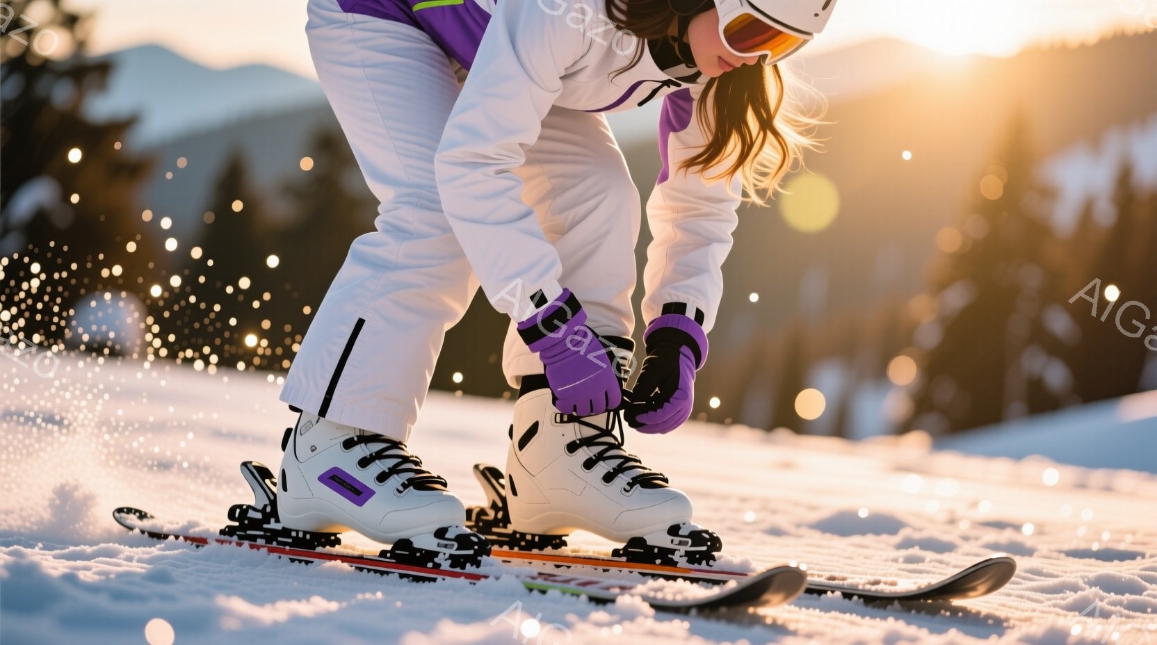 白いスキーウェアに身を包んだ女性が、雪上にてスキーブーツの紐を結んでいます。金色の髪を後ろでまとめ、濃い紫色のゴーグルをかけており、顔はほとんど見えません。背景には雪に覆われた山々と、夕焼けのような光が差し込み、冬の静かで美しい雰囲気を醸し出しています。