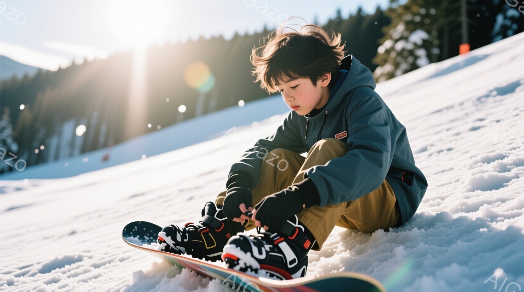 雪山の中で、少年がスノーボードのブーツの紐を結んでいます。彼は青いジャケットに白いストライプと黒いズボンを着用し、髪は少し無造作に整えられています。背景には緑の針葉樹林と白い雪山が広がり、晴れた空の下、冬の穏やかな雰囲気が漂っています。
