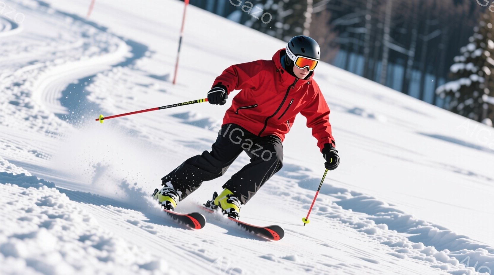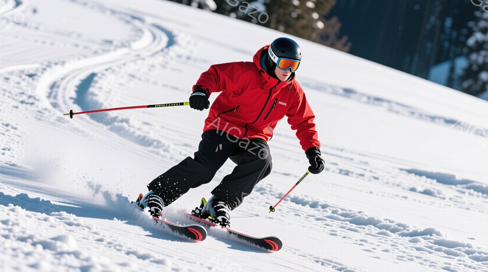 スキーヤーが雪山を滑走している様子が写っている。彼は赤いスキーウェア、黒いズボン、黒いヘルメットを着用し、ゴーグルで顔を覆っている。背景には雪景色が広がり、滑走路にはスキーの跡が並んでいる。