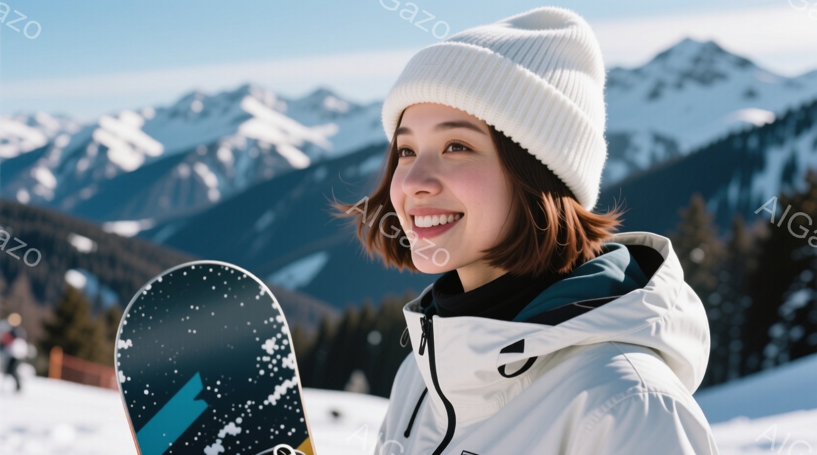 スキーウェアを着た若い女性が、雪山を背景に笑顔で立っています。彼女はターコイズブルーのジャケットと黒のインナー、白いニット帽を着用し、茶色の短い髪は肩にかかっています。背景には雪を抱いた山々が広がり、晴天で雪が輝き、全体的に明るく爽やかな雰囲気が漂っています。