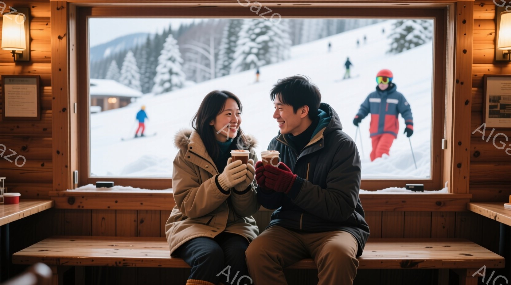 窓際の席に座り、暖かい飲み物を手にしている若い男女が写っています。女性はベージュのコートと黒いパンツ、長い髪をなびかせ、笑顔で男性を見つめています。背景には雪山とスキー場があり、冬の暖かく幸せな雰囲気が漂っています。